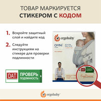 Вся продукция Ergobaby, официально поставляемая на территорию Российской Федерации и стран еаэс, маркируется особыми стикерами DAT Brand Control с уникальным кодом. Для проверки продукта необходимо снять верхний слой и отправить код на короткий номер указанный на стикере (бесплатно) или проверить на сайте.