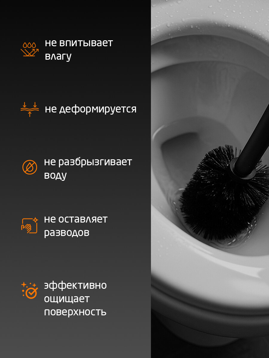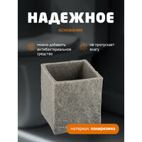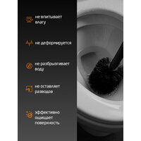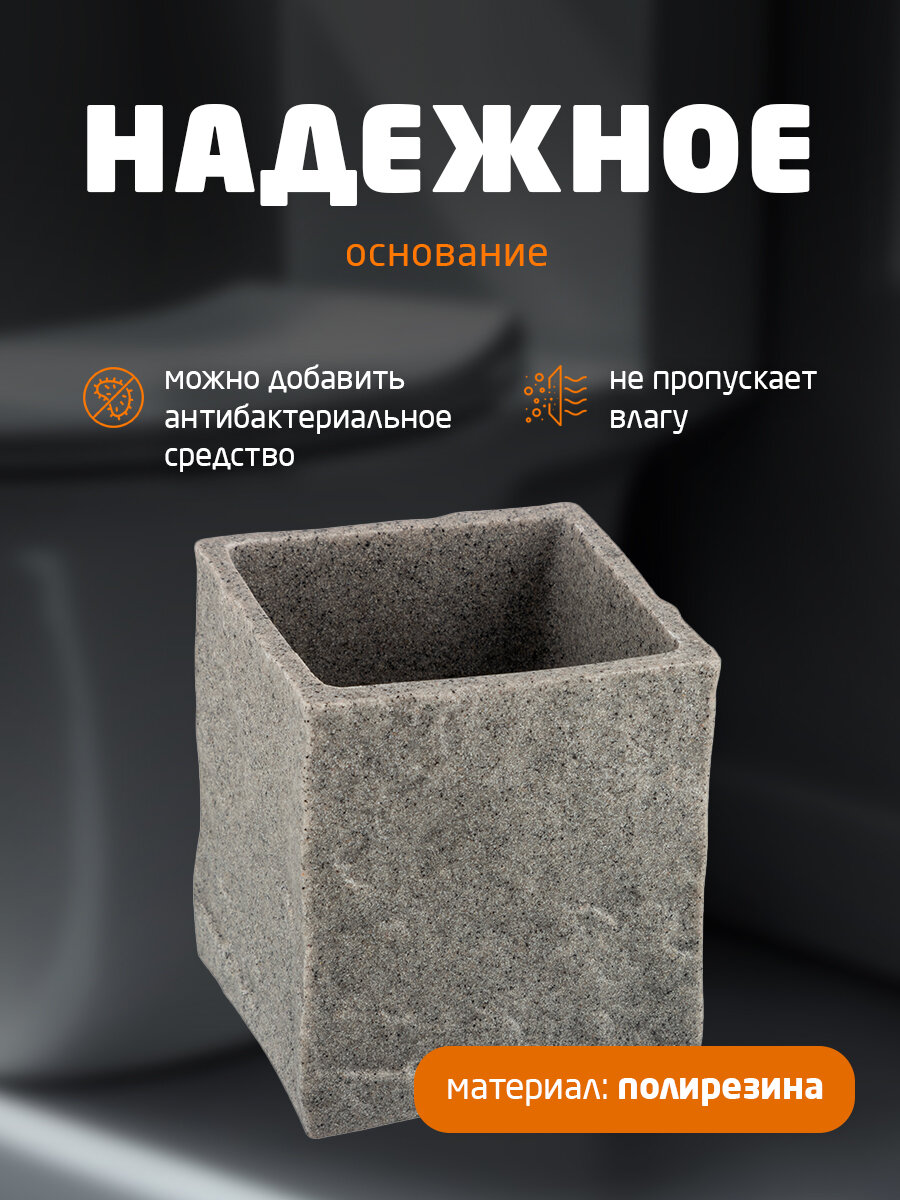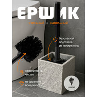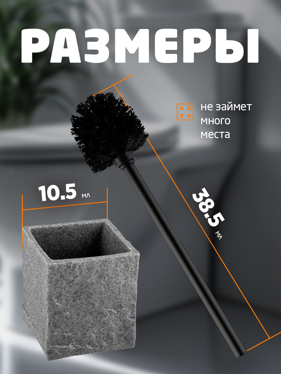 Подставка имеет квадратную форму и выполнена из полирезина, что придает ей устойчивость и позволяет выдерживать вес щетки и ершика. Размеры подставки составляют 10,5 x 10,5 x 38,5 см, что делает ее компактной и удобной для размещения в любом уголке туалетной комнаты.