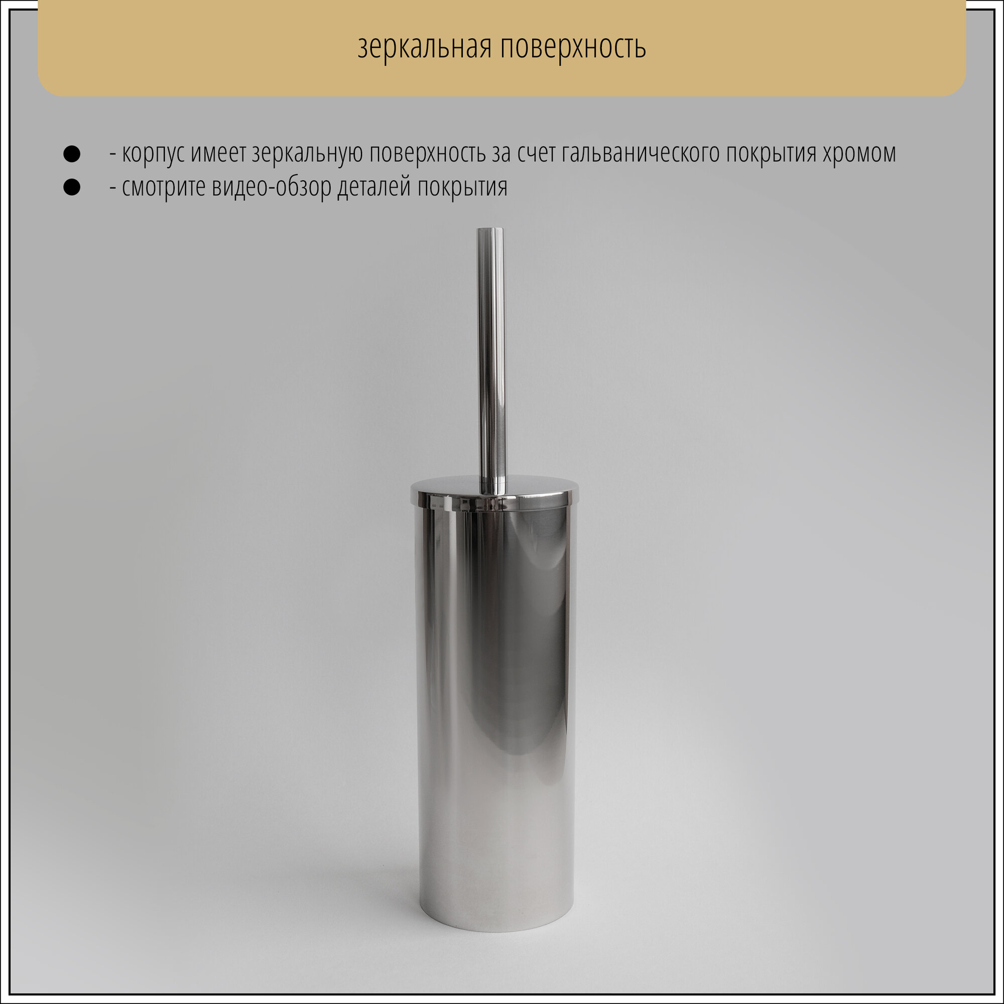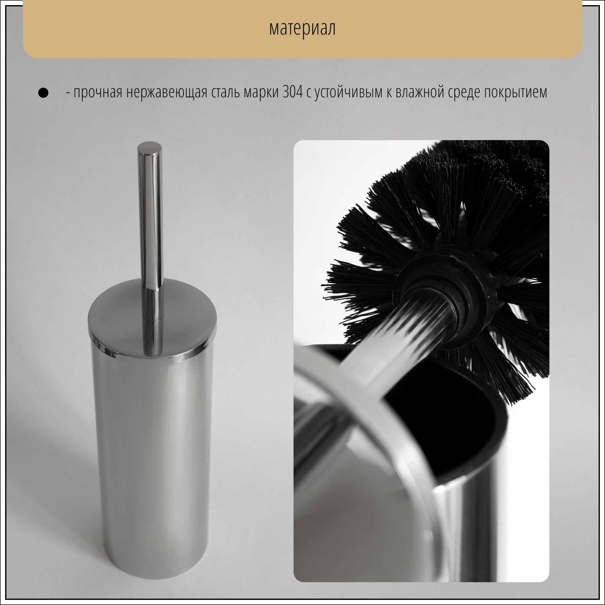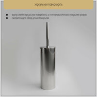Ершик выполнен из прочной нержавеющей стали марки 304 с гальваническим покрытием хромом (корпус, крышка и ручка). Вес модели - 700 грамм, она прочная и тяжелая. Ершик подойдет для HoReCa.
