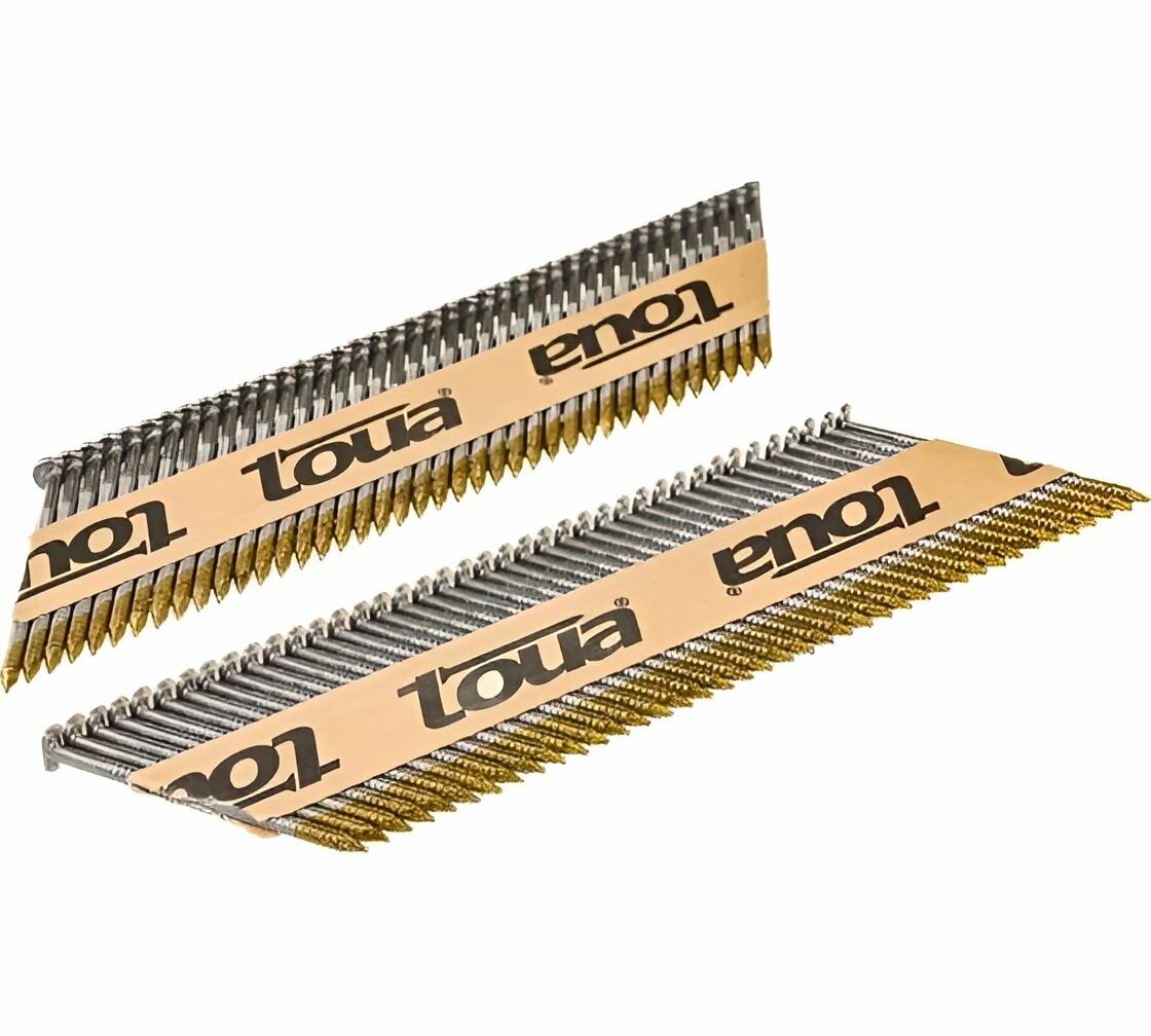 Реечные гвозди широко используются как в деревянном строительстве для сборки стропильных систем и деревянных каркасов, так и для обрешетки грузов на упаковочных работах. Наклон магазина позволяет подлезать инструментом в узкие места и между балками. Особенностью реечных гвоздей Toua является точное соблюдение шага между гвоздями в кассете, что позволяет поршню при забивании гвоздя не задевать шляпку соседнего гвоздя и продлевает срок жизни поршня на реечном нейлере с углом наклона магазина 30-34 градуса.