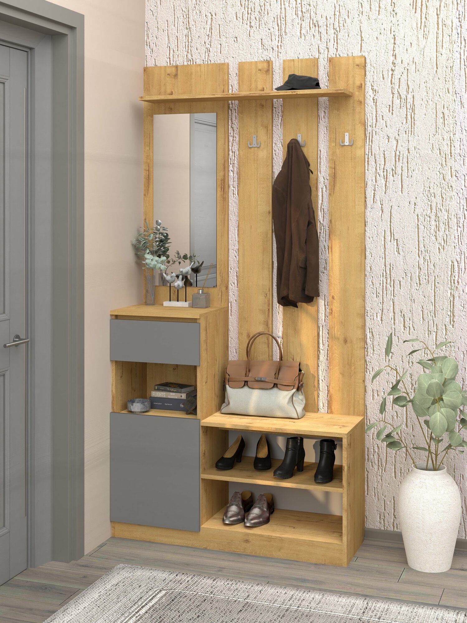 Купить Есэндвич Депо 3 Прихожая 100х200х35 см (Дуб бунратти/Вулканический серый), с зеркалом, с полками и ящиком с доставкой по всей России. Есэндвич Депо 3 Прихожая 100х200х35 см (Дуб бунратти/Вулканический серый), с зеркалом, с полками и ящиком: сравнение цен, характеристики, фото, актуальное наличие и цены.