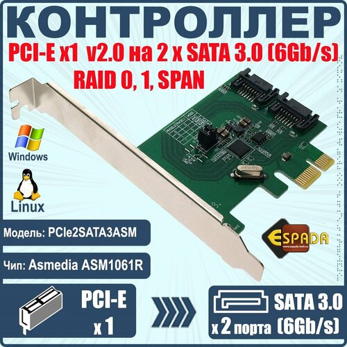 Контроллер PCI-E 2.0 to 2 port SATA3 6Gb/s, RAID, чип ASM1061R, модель PCIe2SATA3ASM Espada: сравнение цен, характеристики, фото, актуальное наличие и цены.