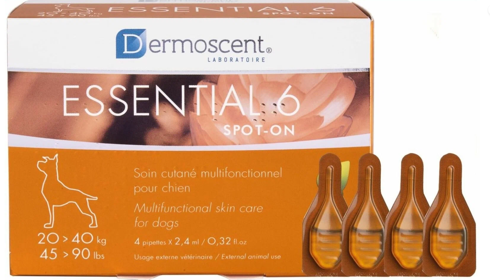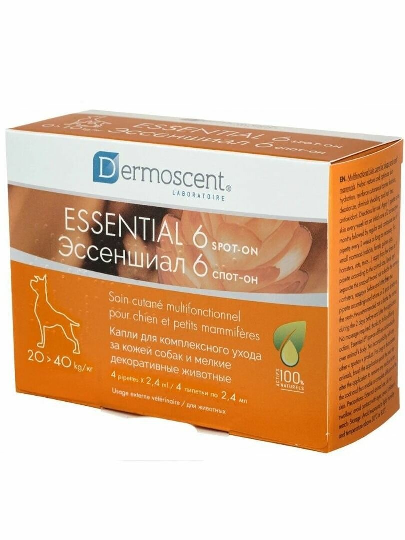 Dermoscent Essential 6 Spot-On рекомендован ветеринарами как безопасное и эффективное средство для ежедневного ухода за кожей и шерстью собак. 4 пипетки, по 2,4 мл.