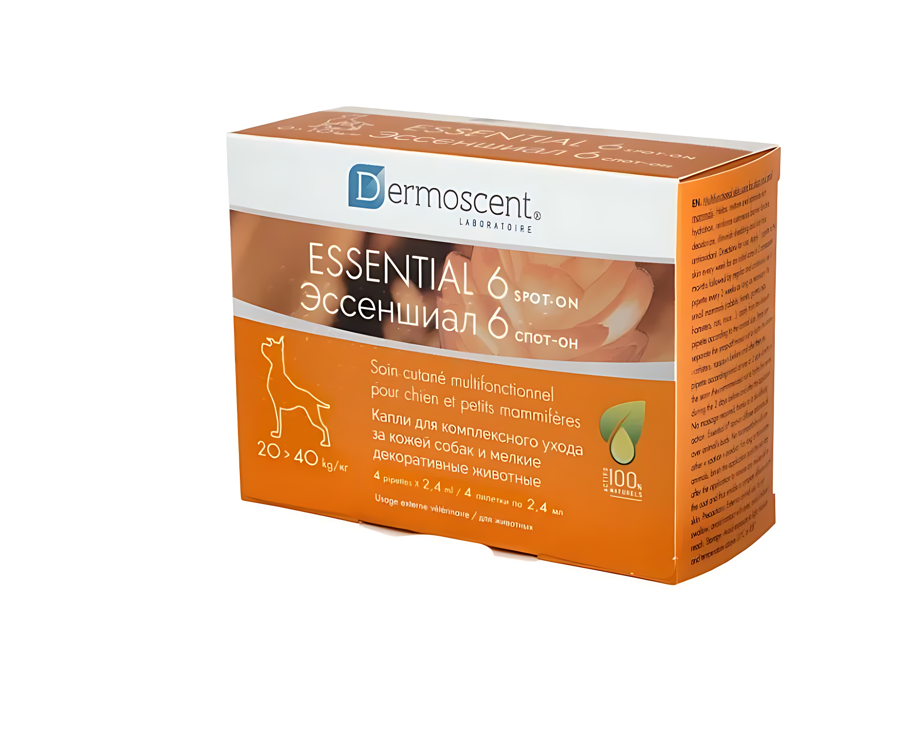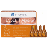 Dermoscent Essential 6 Spot-On Dog 20-40 кг — это инновационное средство для поддержания здоровья кожи и шерсти у собак среднего и крупного размера (весом от 20 до 40 кг). Препарат представляет собой комплексный уход в виде спот-он капель, которые обеспечивают глубокое питание кожи, увлажнение и восстановление её защитного барьера.