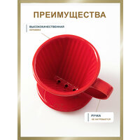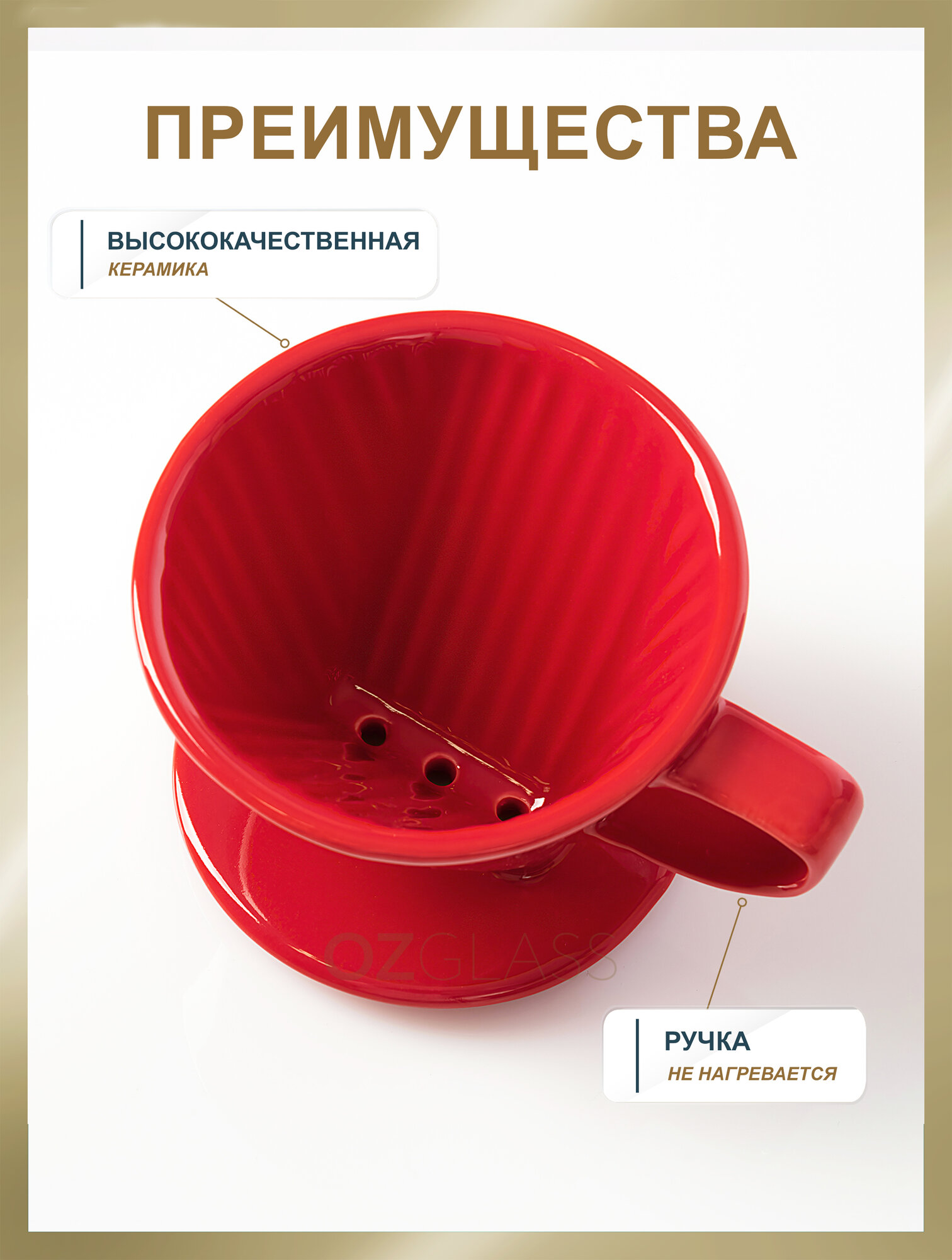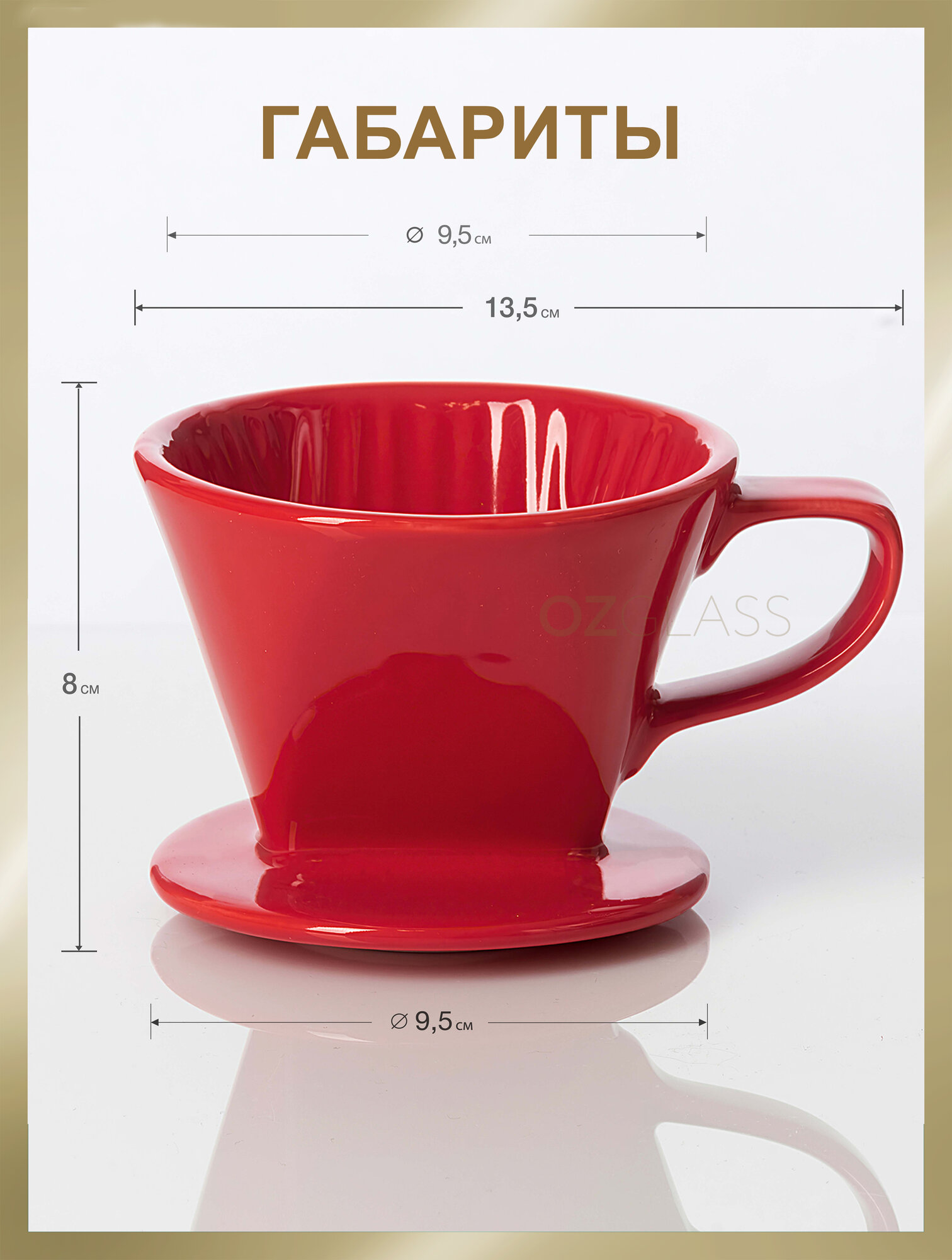 Воронка-дриппер для заваривания кофе методом пуровер выполнена из высококачественной керамики. Данная воронка может быть использована на любую чашку или любой другой сервировочный чайник для кофе. Для воронки так же потребуются бумажные фильтры которые представлены в нашем каталоге отбеленные и неотбеленные (Артикулы: N2/U102-W и N2/U102-B). Как вариант, можете рассмотреть в нашем каталоге сервировочный заварочный чайник на 600 мл (Артикул: STG032). Чайник стеклянный прозрачный имеет классическую форму и большую удобную ручку. Купить такой чайник можно для использования в домашних условиях и для красивой подачи чая в кафе. И возвращаясь опять к нашему дриперу, представляем Вам характеристики размеров воронки, также на фотографии №2, представлены размеры визуально. Объем воронки рассчитан на 8 чашек кофе. Воронка продается в индивидуальной коробке из картона.