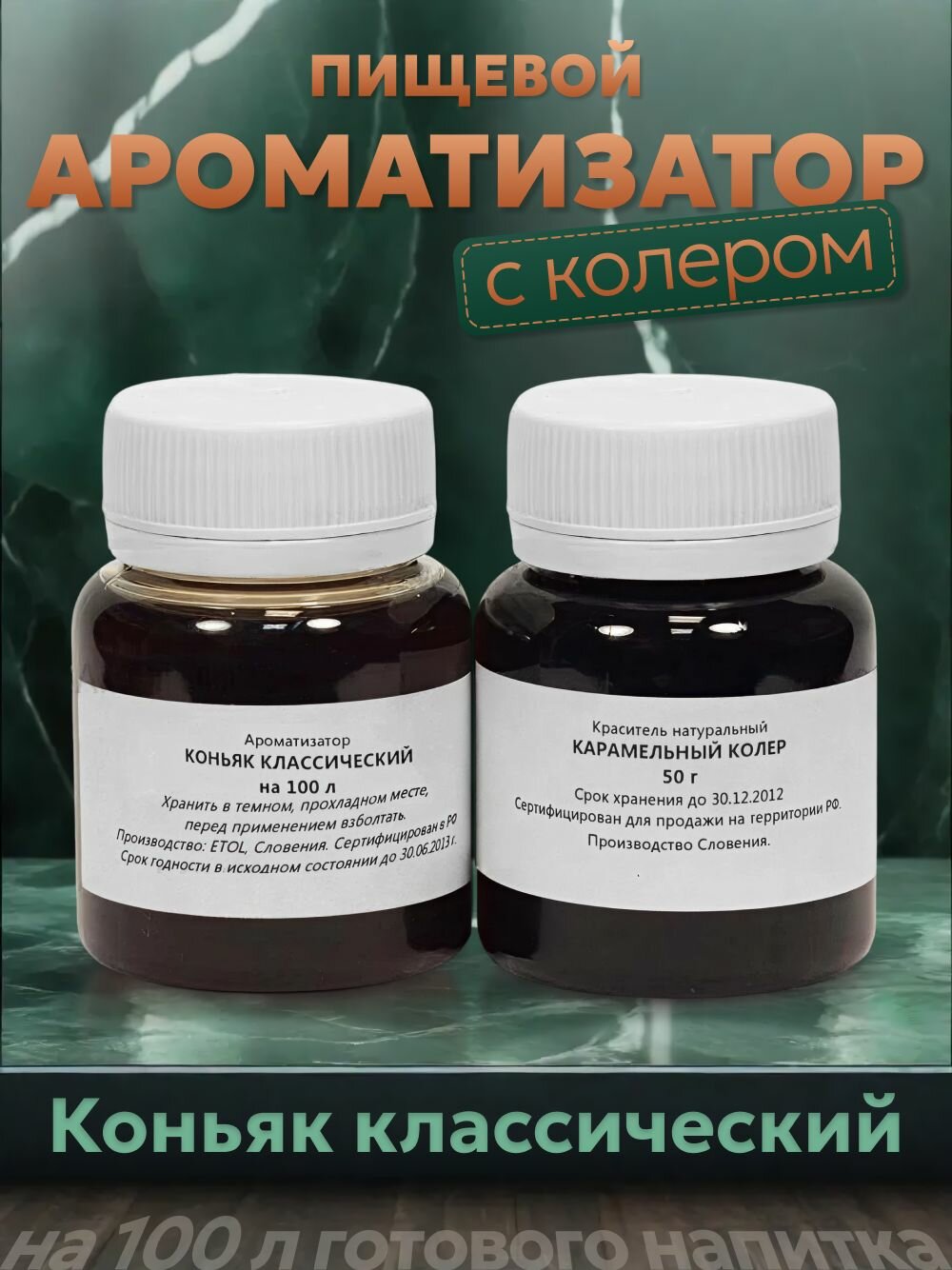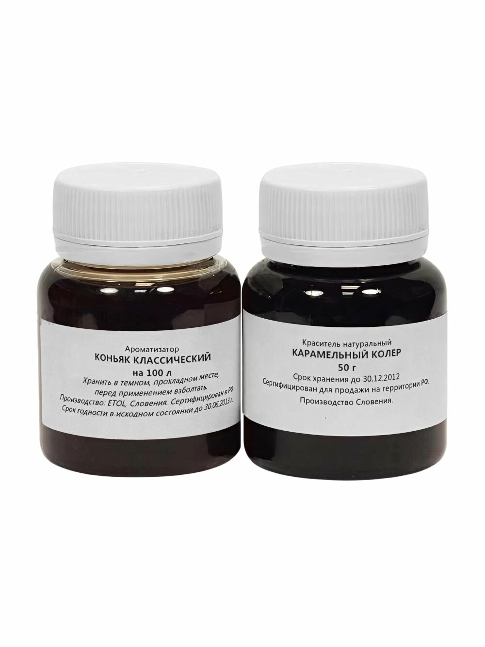 - Состав: пищевые жидкие ароматизаторы "Коньяк" и карамельный колер.
