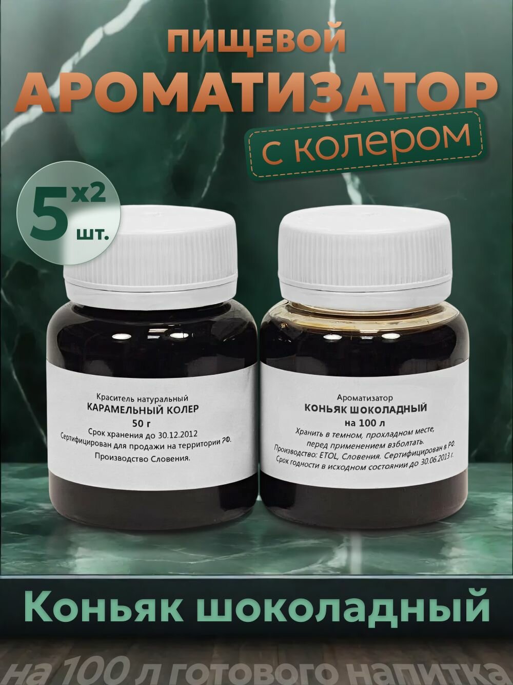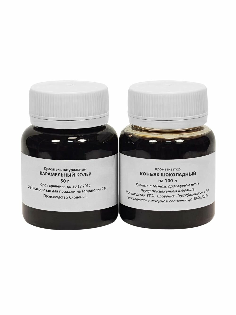 - Состав: пищевые жидкие ароматизаторы "Коньяк" и "Шоколад", карамельный колер.
