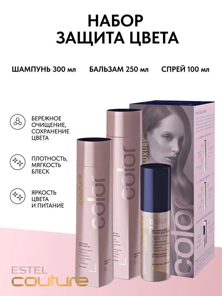 Купить ESTEL Набор HAUTE COUTURE LUXURY COLOR для окрашенных волос Шампунь 300 + Бальзам 250 + Спрей 100 мл. с доставкой по всей России. ESTEL Набор HAUTE COUTURE LUXURY COLOR для окрашенных волос Шампунь 300 + Бальзам 250 + Спрей 100 мл.: сравнение цен, характеристики, фото, актуальное наличие и цены.