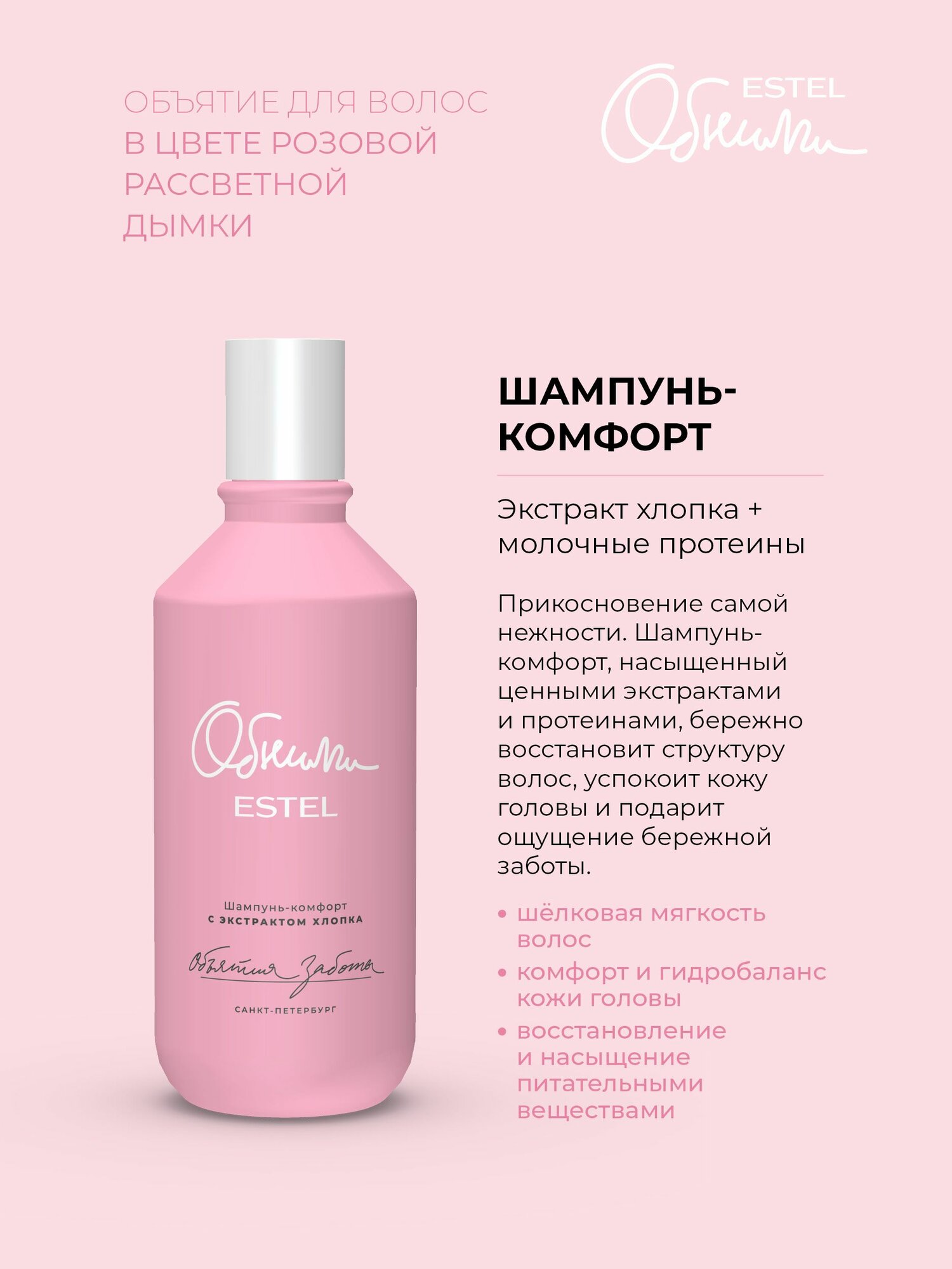 Шампунь-комфорт для волос и кожи головы с экстрактом хлопка «Объятия заботы» ESTEL ОБНИМИ Применение: нанесите деликатный шампунь на влажные волосы, мягко помассируйте кожу головы, распределяя шампунь, смойте тёплой водой. Кондиционер-восстановление для волос с экстрактом хлопка «Объятия заботы» ESTEL ОБНИМИ Применение: нанесите нежный кондиционер на чистые влажные волосы, оставьте на 2-3 минуты, смойте тёплой водой. Почувствуйте объятие заботы. Сыворотка-уход для кончиков волос с экстрактом хлопка «Объятия заботы» ESTEL ОБНИМИ Применение: несколько капель лёгкой сыворотки распределите между ладонями, аккуратными движениями нанесите на кончики волос. Не смывайте.