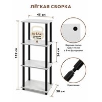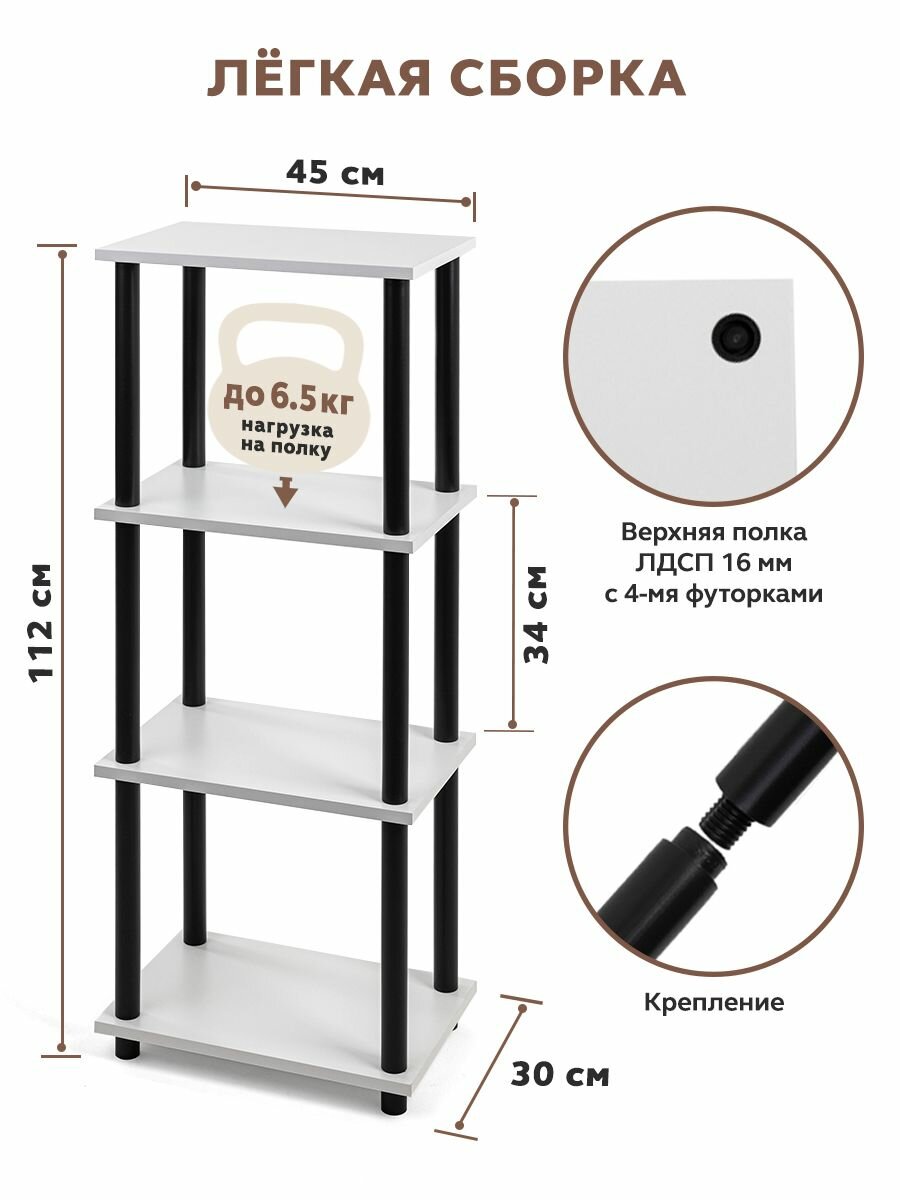 Этажерка деревянная GASTRORAG - это многофункциональная мебель для квартиры, дома, дачи, офиса. Дизайнеры разработали универсальную, доступную всем 4-ярусную систему хранения вещей для любых помещений: для прихожей, кухни, гостиной, детской, кабинета, балкона. Ее можно использовать как стеллаж для кухонной техники, посуды, овощей и фруктов, напольную этажерку для книг, детских игрушек и предметов интерьера, подставку из дерева для цветов и рассады, офисную мебель для папок, канцелярии и оргтехники. Открытый стеллаж укомплектован 4 полками из ЛДСП, которые соединяются между собой стойками из пластиковой трубы черного цвета. Размеры полки 45х30 см, высота мебели в собранном виде 112,5 см. Расстояние между полками этажерки 34 см, что позволяет размещать на них даже крупногабаритные вещи. Стеллаж ЛДСП имеет небольшой вес, быстро собирается без инструментов и легко переносится с места на место. Нагрузка на полку до 6,5 кг. Благодаря современному минималистичному дизайну этажерка лофт впишется в любой интерьер.