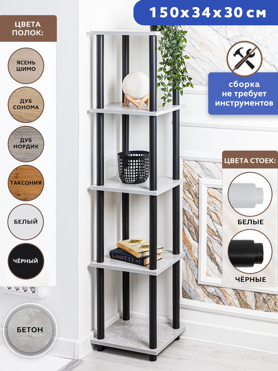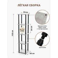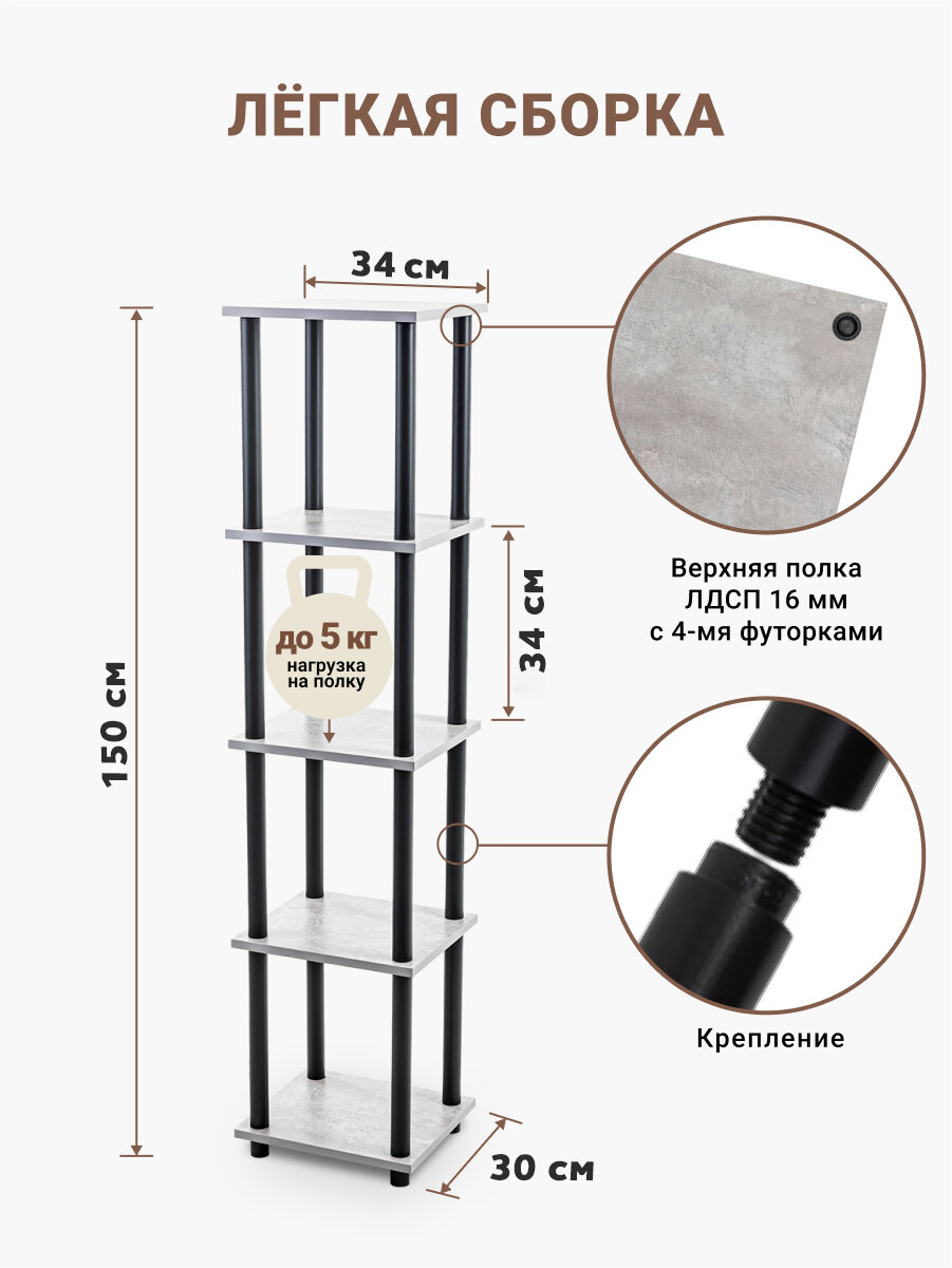 Этажерка деревянная 5 полок Gastrorag - это многофункциональная мебель для дома, дачи, офиса, салона красоты и косметологического кабинета. Мы разработали для вас универсальную и доступную 5 ярусную систему хранения вещей для любой комнаты в вашей квартире: прихожей и коридора, кухни, ванной и туалета, балкона и лоджии, гардеробной, кабинета, гостиной и спальни. Ее можно использовать как шкафчик для обуви и сумок или компактную обувницу в прихожей, полку для гардероба, полочку для полотенец в ванне или стеллаж для кухонной техники, посуды, овощей и фруктов. Она подойдет для хранения одежды и в качестве маленькой напольной книжной этажерки 5 секций для книг, детских игрушек и машинок, декора и предметов интерьера, подставки из дерева для домашних декоративных растений, комнатных цветов и рассады. Из нее получится отличная офисная стойка для папок, документов, канцелярских принадлежностей и оргтехники или этажерка для косметолога, мастера маникюра и педикюра, органайзер для косметики и духов. Открытый высокий стеллаж на пол не загромождает интерьер и придает ему легкость. Вы можете поставить его в угол, узкую нишу или, например, купить несколько штук и собрать из них один большой открытый шкаф, мини стенку или перегородку для зонирования и организации пространства. Этажерка loft пять ярусов укомплектована полками из экологичной ЛДСП класса Е0.5. Изделия из этого материала можно безопасно использовать даже в детской - для ребенка, подростка и школьника. Полочки соединяются между собой стойками из пластиковой трубы диаметром 34 мм. Размер полки 34х30 см, высота мебели в собранном виде 150 см. Расстояние между полками этажерки 34 см, что позволяет размещать на них даже крупногабаритные предметы. Стеллаж ЛДСП пяти полочный имеет небольшой вес, быстро собирается без инструментов и легко переносится с места на место. Благодаря современному минималистичному дизайну 5 секционная этажерка в стиле лофт впишется в любой интерьер. Обратите внимание! Сборку нужно начинать с верхней полки! Допустимая распределенная нагрузка на полку до 5 кг. Для большей устойчивости рекомендуем ставить стеллаж вплотную к стене.