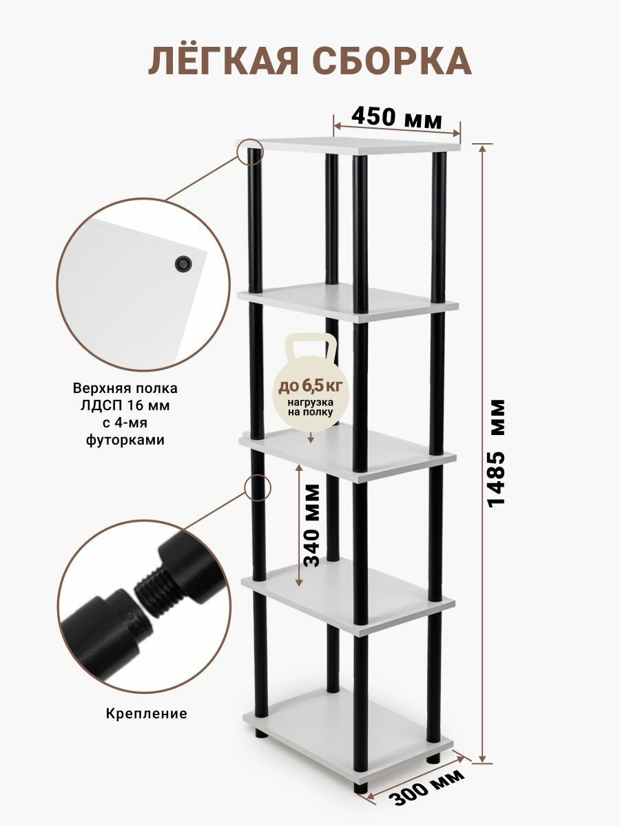 Стеллаж ЛДСП GASTRORAG 1450/5 - это многофункциональная мебель для квартиры, дома, дачи, офиса. Дизайнеры разработали универсальную и доступную всем 5-ярусную систему хранения вещей для любых помещений: для прихожей, кухни, гостиной, детской, кабинета, балкона. Ее можно использовать как стеллаж для кухонной техники, посуды, овощей и фруктов, напольную этажерку для книг, детских игрушек и предметов интерьера, подставку из дерева для цветов и рассады, офисную мебель для папок, канцелярии и оргтехники. Открытый стеллаж укомплектован 5 полками из ЛДСП толщиной 16 мм, которые соединяются между собой стойками из пластиковой трубы черного цвета диаметром 34 мм. Размеры полки 45х30 см, высота мебели в собранном виде 148.5 см. Расстояние между полками этажерки 34 см, что позволяет размещать на них даже крупногабаритные вещи. Стеллаж ЛДСП имеет небольшой вес, быстро собирается без инструментов и легко переносится с места на место. Нагрузка на полку до 6,5 кг. Благодаря современному минималистичному дизайну этажерка лофт впишется в любой интерьер.