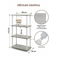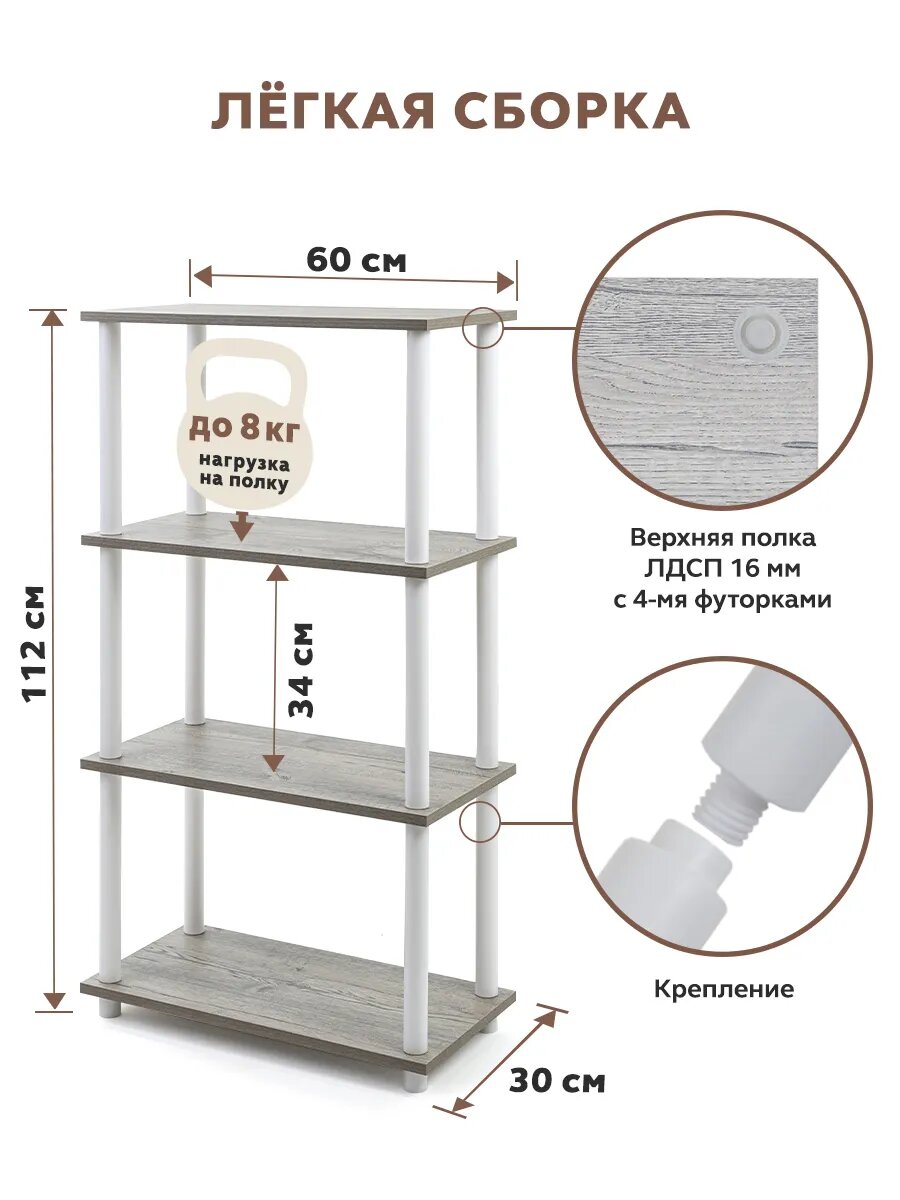 Этажерка деревянная 4 полки Gastrorag - это многофункциональная мебель для дома, дачи, офиса, салона красоты и косметологического кабинета. Мы разработали для вас универсальную и доступную 4 ярусную систему хранения вещей для любой комнаты в вашей квартире: прихожей и коридора, кухни, ванной и туалета, балкона и лоджии, гардеробной, кабинета, гостиной и спальни. Ее можно использовать как шкафчик для обуви и сумок или компактную обувницу в прихожей, полку для гардероба, полочку для полотенец в ванне или стеллаж для кухонной техники, посуды, овощей и фруктов. Она подойдет для хранения одежды и в качестве маленькой напольной книжной этажерки 4 секции для книг, детских игрушек и машинок, декора и предметов интерьера, подставки из дерева для домашних декоративных растений, комнатных цветов и рассады. Из нее получится отличная офисная стойка для папок, документов, канцелярских принадлежностей и оргтехники или этажерка для косметолога, мастера маникюра и педикюра, органайзер для косметики и духов. Открытый высокий стеллаж на пол не загромождает интерьер и придает ему легкость. Вы можете поставить его в угол, узкую нишу или, например, купить несколько штук и собрать из них один большой открытый шкаф, мини стенку или перегородку для зонирования и организации пространства. Этажерка loft четыре яруса укомплектована полками из экологичной ЛДСП класса Е0.5. Изделия из этого материала можно безопасно использовать даже в детской - для ребенка, подростка и школьника. Полочки соединяются между собой стойками из пластиковой трубы диаметром 34 мм. Размер полки 60х30 см, высота мебели в собранном виде 113 см. Расстояние между полками этажерки 34 см, что позволяет размещать на них даже крупногабаритные предметы. Стеллаж ЛДСП четырех полочный имеет небольшой вес, быстро собирается без инструментов и легко переносится с места на место. Благодаря современному минималистичному дизайну 4 секционная этажерка в стиле лофт впишется в любой интерьер. Обратите внимание! Сборку нужно начинать с верхней полки! Допустимая распределенная нагрузка на полку до 8 кг. Для большей устойчивости рекомендуем ставить стеллаж вплотную к стене.
