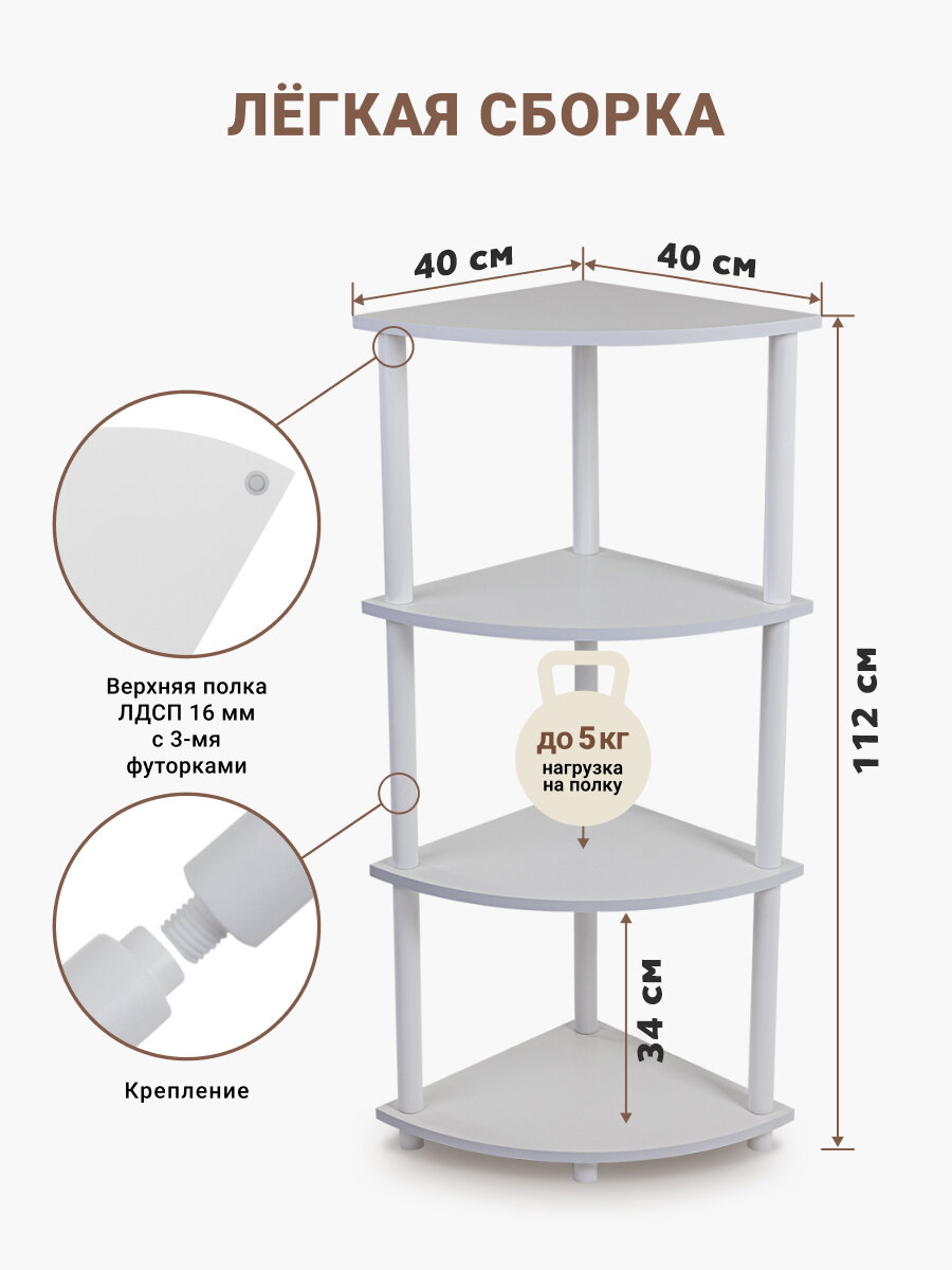 Этажерка деревянная Gastrorag GR-4TC1 - это многофункциональная мебель для квартиры, дома, дачи, офиса. Дизайнеры создали универсальную 4-ярусную систему хранения вещей для любых помещений: для прихожей, кухни, гостиной, детской, кабинета, балкона. Ее можно использовать как стеллаж для кухонной техники, посуды, овощей и фруктов, напольную этажерку для книг, детских игрушек и предметов интерьера, подставку из дерева для цветов и рассады, офисную мебель для папок, канцелярии и оргтехники. Угловая этажерка создает дополнительные места хранения в углах комнат, которые обычно практически не используются. Открытый стеллаж укомплектован 4 полками из ЛДСП толщиной 15 мм, которые соединяются между собой стойками из пластиковой трубы черного цвета диаметром 32 мм. Размеры полки 39.5х39.5 см, высота мебели в собранном виде 112 см. Расстояние между полками этажерки 34 см, что позволяет размещать на них даже крупногабаритные вещи. Стеллаж ЛДСП имеет небольшой вес, быстро собирается без инструментов и легко переносится с места на место. Нагрузка на полку до 6 кг. Благодаря современному минималистичному дизайну этажерка лофт впишется в любой интерьер. Цвет ЛДСП по выбору: бук (SB), тауп (серо-коричневый, DT), эспрессо (темно-коричневый, ES).