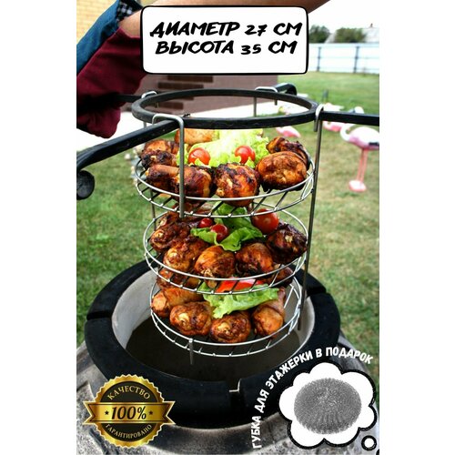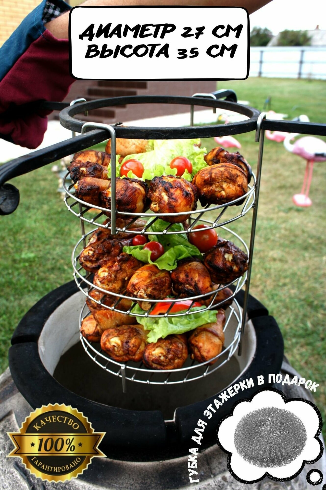 Этажерка для тандыра позволяет приготовить множество мясных, грибных, рыбных или овощных блюд, причём нередко одновременно: на нижнем ярусе может разместиться один вид продуктов, на среднем — иной, и на верхнем расположится третий. Этажерка нашего производства очень прочна, производится из пищевой нержавеющей стали, включает в себя и дополнительное кольцо, которое не позволяет продуктам «выскочить» за её пределы.