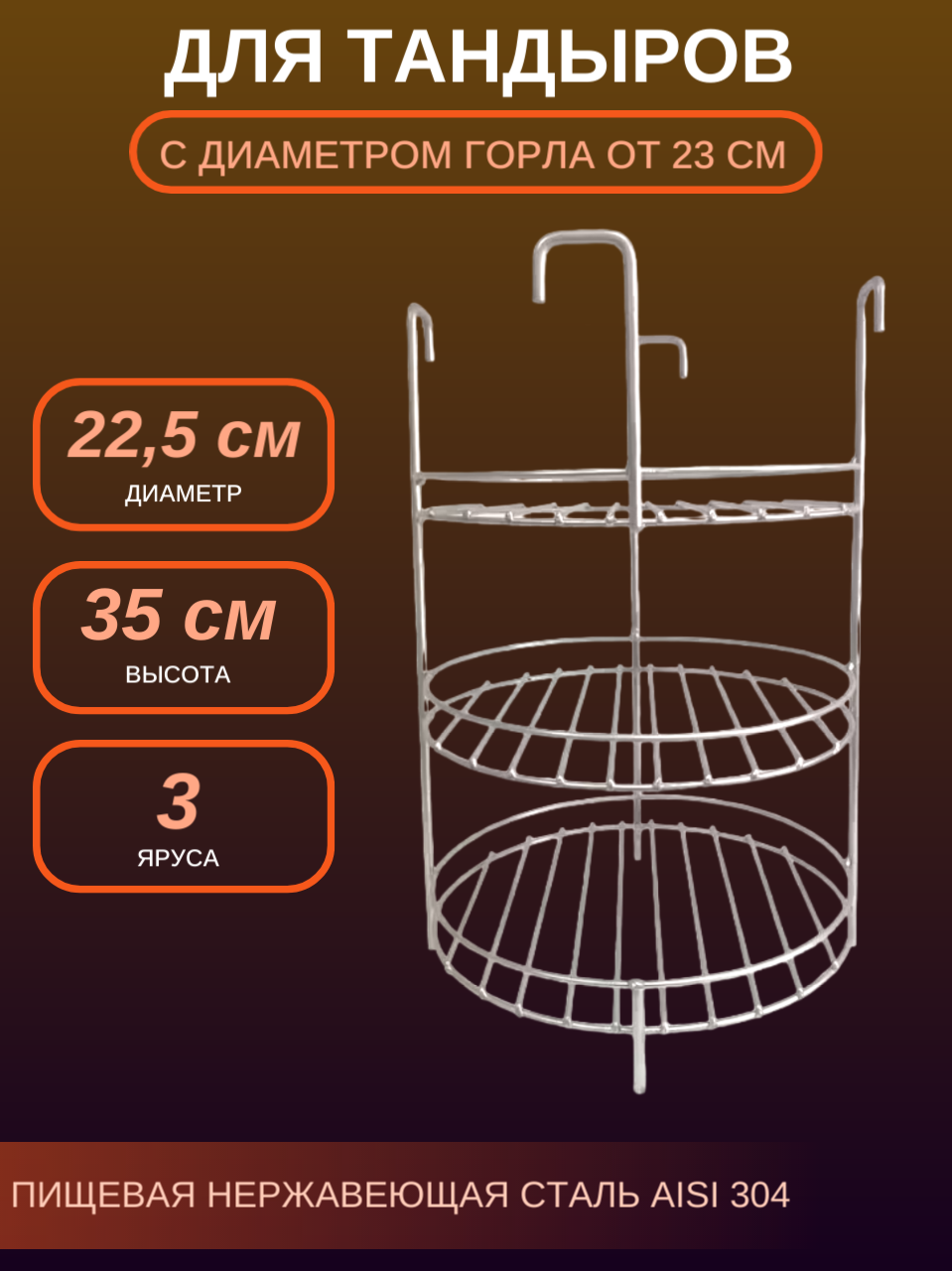 Советуем обратить внимание на чудо аксессуар - этажерку. По опыту скажем, “Этажерка” для тандыра станет незаменимым помощником в приготовлении большинства вкуснейших блюд. На тандырной сетке можно приготовить максимальное количество блюд, например куриных крылышек с овощами или же заложить большой кусок мяса, вашим фантазиям нет предела!) Мясные продукты можно приготовить для большой компании всего за один этап.