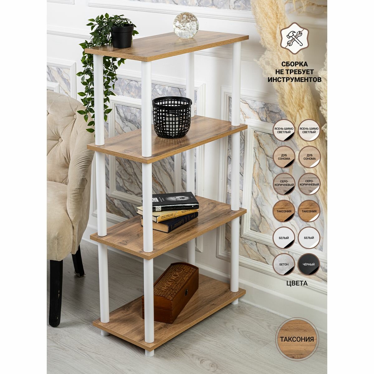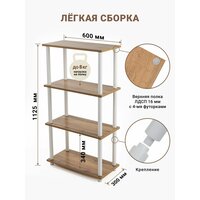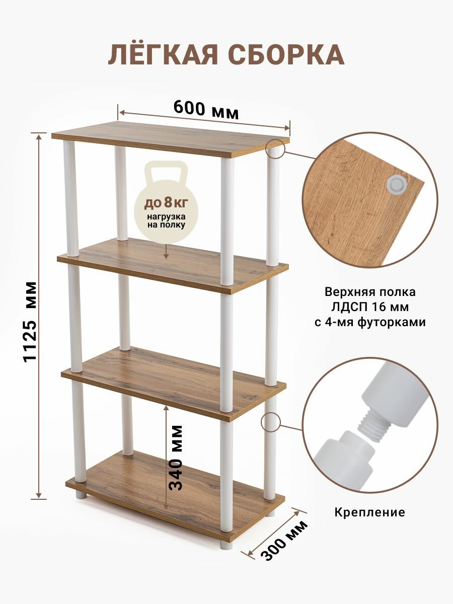 Этажерка деревянная 4 полки Gastrorag - это многофункциональная мебель для дома, дачи, офиса, салона красоты и косметологического кабинета. Мы разработали для вас универсальную и доступную 4 ярусную систему хранения вещей для любой комнаты в вашей квартире: прихожей и коридора, кухни, ванной и туалета, балкона и лоджии, гардеробной, кабинета, гостиной и спальни. Ее можно использовать как шкафчик для обуви и сумок или компактную обувницу в прихожей, полку для гардероба, полочку для полотенец в ванне или стеллаж для кухонной техники, посуды, овощей и фруктов. Она подойдет для хранения одежды и в качестве маленькой напольной книжной этажерки 4 секции для книг, детских игрушек и машинок, декора и предметов интерьера, подставки из дерева для домашних декоративных растений, комнатных цветов и рассады. Из нее получится отличная офисная стойка для папок, документов, канцелярских принадлежностей и оргтехники или этажерка для косметолога, мастера маникюра и педикюра, органайзер для косметики и духов. Открытый высокий стеллаж на пол не загромождает интерьер и придает ему легкость. Вы можете поставить его в угол, узкую нишу или, например, купить несколько штук и собрать из них один большой открытый шкаф, мини стенку или перегородку для зонирования и организации пространства. Этажерка loft четыре яруса укомплектована полками из экологичной ЛДСП класса Е0.5. Изделия из этого материала можно безопасно использовать даже в детской - для ребенка, подростка и школьника. Полочки соединяются между собой стойками из пластиковой трубы диаметром 34 мм. Размер полки 60х30 см, высота мебели в собранном виде 113 см. Расстояние между полками этажерки 34 см, что позволяет размещать на них даже крупногабаритные предметы. Стеллаж ЛДСП четырех полочный имеет небольшой вес, быстро собирается без инструментов и легко переносится с места на место. Благодаря современному минималистичному дизайну 4 секционная этажерка в стиле лофт впишется в любой интерьер. Обратите внимание! Сборку нужно начинать с верхней полки! Допустимая распределенная нагрузка на полку до 8 кг. Для большей устойчивости рекомендуем ставить стеллаж вплотную к стене.