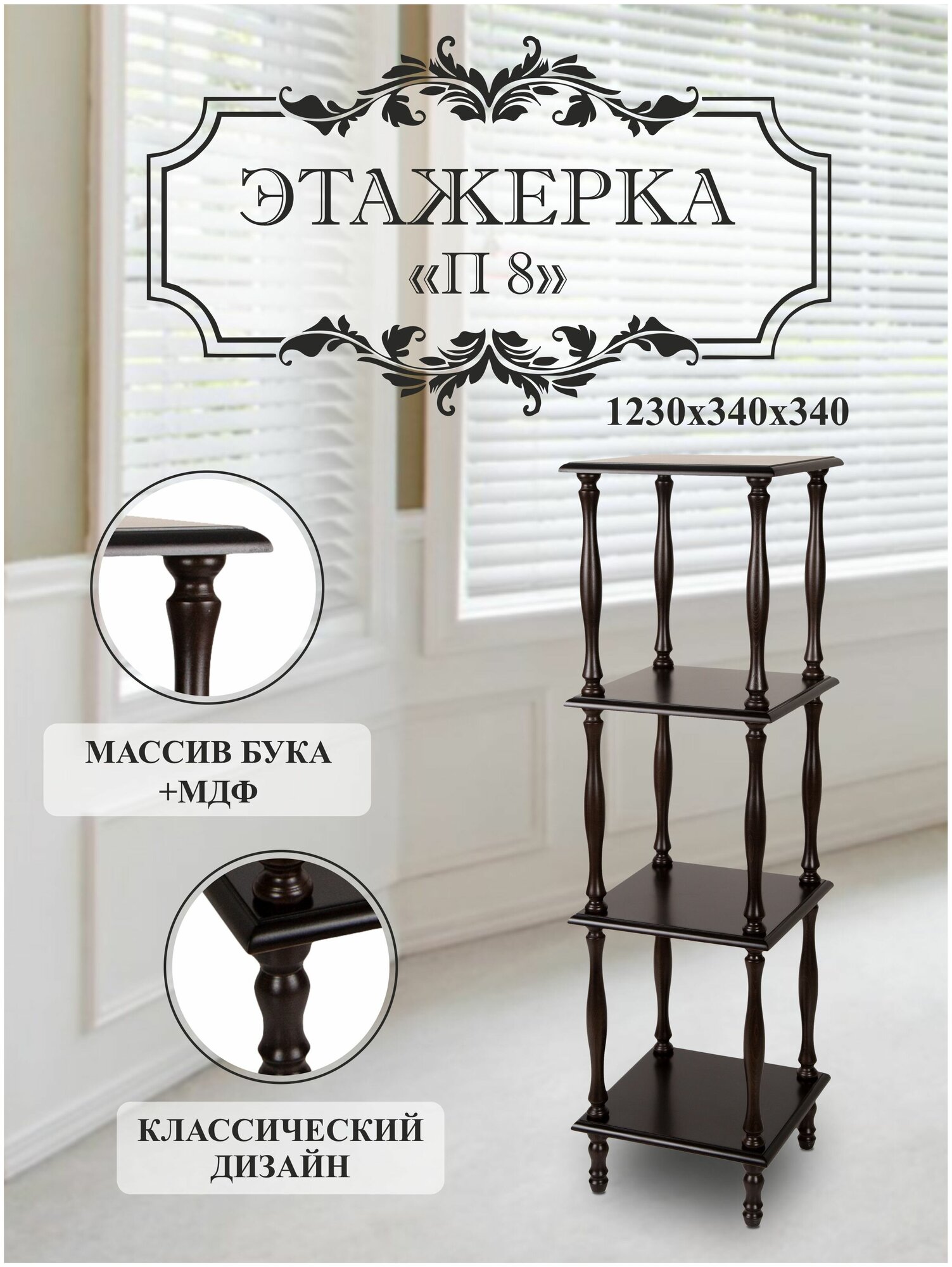 Красивая этажерка для гостиной, кухни, дачи. Очень вместительная, емеет несколько полочек. Предметы этой коллекции объединяют изящные ножки, которые изготовлены из натурального массива бука, Этажерка предназначена для размещения на ней интерьерных скульптур, книг, интерьерных ваз, ваз с цветами, настольных часов, прочих интерьерных декоративных предметов, которые так необходимы для создания в окружающей обстановке состояния завершенности, наполненности, подчеркивая статус и вкус владельца. Легко собирается, компактно упакована