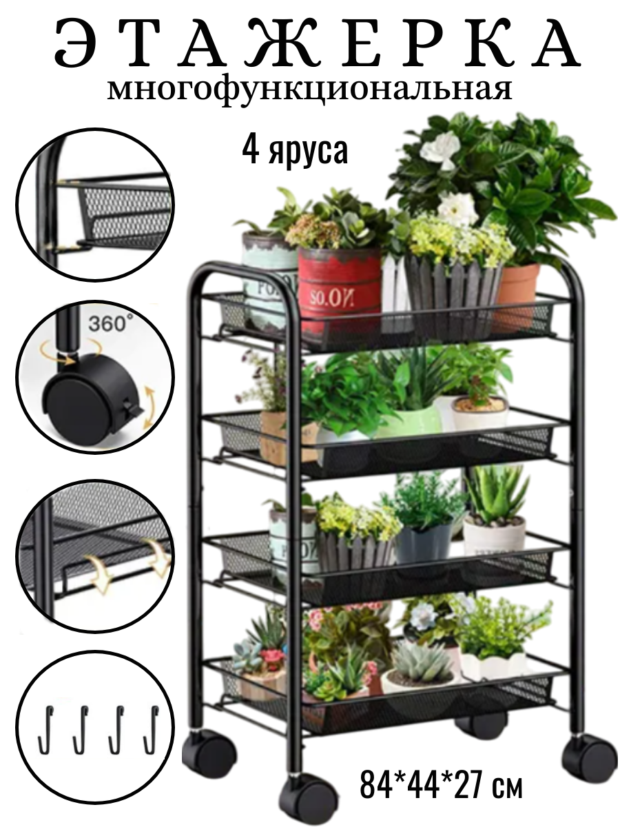 Этажерка на колесиках напольная 4-х ярусная, металлическая, черная 84х44х27 см: сравнение цен, характеристики, фото, актуальное наличие и цены.