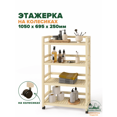Деревянная этажерка идеально подходит для организации пространства, позволяя разместить вещи удобно и компактно. Стеллаж на колесиках, отлично впишется в интерьер квартиры или дачи. Деревянная конструкция выполнена из массива натурального дерева, что гарантирует экологичность и долговечность мебели. Универсальный по своему применению стеллаж, благодаря лёгкости конструкции хорошо впишется как в офис, так и в детскую комнату. Такую мебель очень часто применяют на кухне, в гардеробе или кладовой. Оснащен практичными полками, что делает его функциональным элементом интерьера. Этажерка подходит для хранения и демонстрации любимых вещей и прекрасно впишется в любой уголок вашего помещения, обеспечивая легкий доступ к предметам. Благодаря наличию колёсиков, вы сможете без труда перемещать его в любое место, что делает использование ещё более удобным.