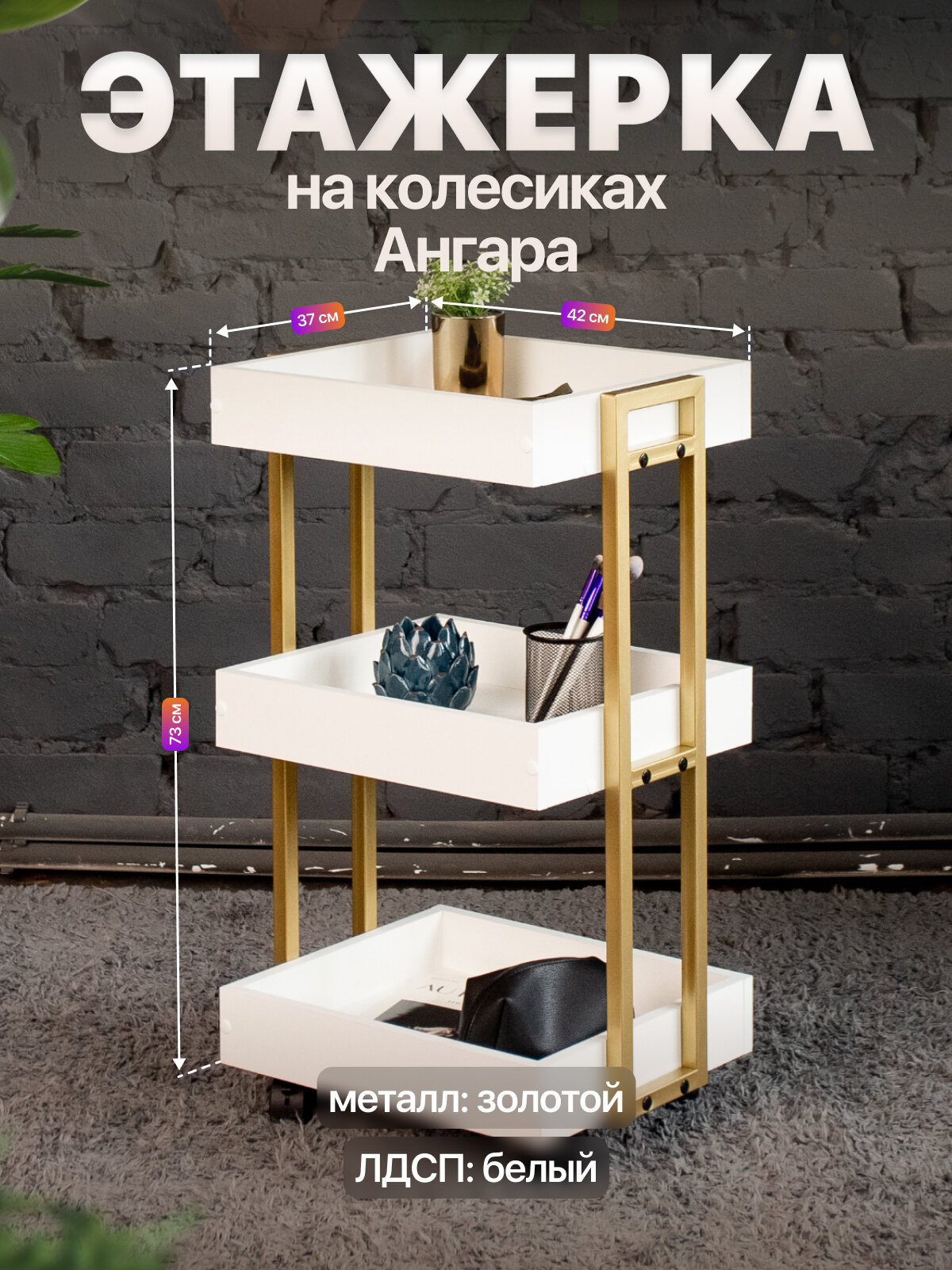 Этажерка на колесиках для дома и офиса в стиле лофт Ангара золотой/белый: сравнение цен, характеристики, фото, актуальное наличие и цены.