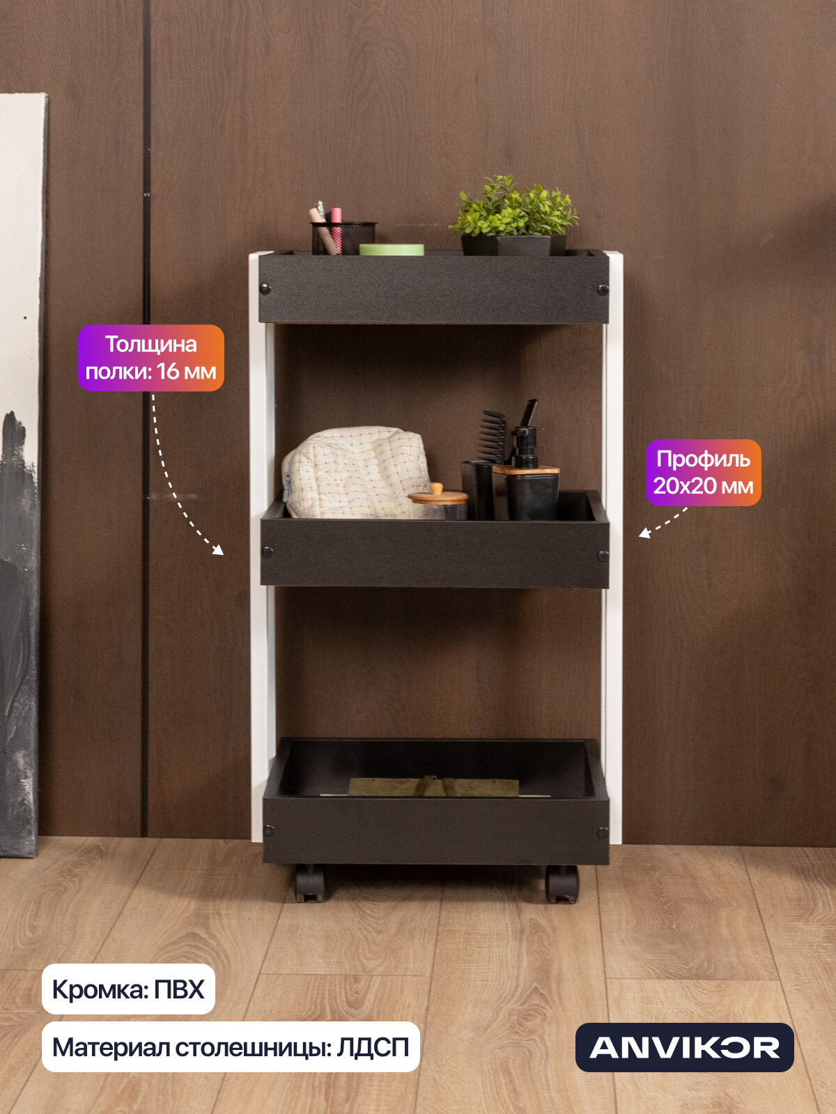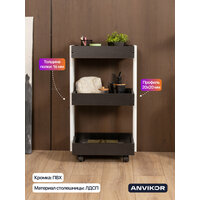 Трехъярусная этажерка «Ангара» — удобный и практичный предмет мебели, с помощью которого можно легко оптимизировать пространство квартиры, дома, офиса или дачи. Три яруса — это достаточное место для хранения декора, книг, кухонной утвари и моющих средств. Также изделие подойдет для размещения косметики, игрушек и инструментов. Бортики обеспечивают сохранность хрупких предметов, предотвращая их опрокидывание. Этажерка на колесиках мобильна и устойчива. Она не повреждает пол при перемещении и не скользит благодаря стопперам, которые препятствуют случайному движению конструкции. Компактную этажерку можно перемещать без лишних усилий. Особенно это удобно, когда нужно сделать в квартире перестановку или пропылесосить, помыть пол. Этажерка не занимает много места — она прекрасно подходит для стандартных однокомнатных квартир и квартир-студий. Ее можно разместить в спальне, гостиной, на кухне, в ванной. Также этажерка подойдет для ограниченной площади прихожей или балкона. Благодаря своему лаконичному дизайну этажерка для хранения отлично впишется в интерьеры в стилях лофт и минимализм. Этажерка пригодится и для обустройства рабочего пространства в офисе: это оптимальный вариант для хранения документов, папок, канцелярских принадлежностей и девайсов.