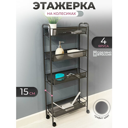 Этажерка изготовлена из прочной стали, покрытой порошково-полимерным покрытием. Такие этажерки имеют устойчивую окраску и не поддаются коррозии, поэтому их можно использовать не только в жилых комнатах, но и на кухне, в ванной комнате, балконе, даче, офисе, холе, на веранде, гардеробной и других помещениях. Этажерка для ванной очень вместительная: металлический стеллаж спокойно вмещает большое количество предметов, а заранее продуманные расстояния между корзинами, позволяют разместить не только мелкие, но и высокие предметы. Каждая корзина выдерживает до 10 кг нагрузки. Небольшая глубина изделия позволит вместиться даже на небольшой кухне, между шкафами или внутри них, или разместить цветочные горшки и растения. Для сборки стеллажа для хранения не нужны специальные инструменты. Благодаря большому ассортименту каждая хозяйка сможет подобрать себе стеллаж по своим предпочтениям: Этажерка с колёсами, стеллаж для хранения без колёс и большой ассортимент цветовой гаммы, который вы сможете увидеть просмотрев фото. Классический дизайн этажерки подойдет для любого интерьера и станет отличным подарком для себя, друзей, родных и близких.
