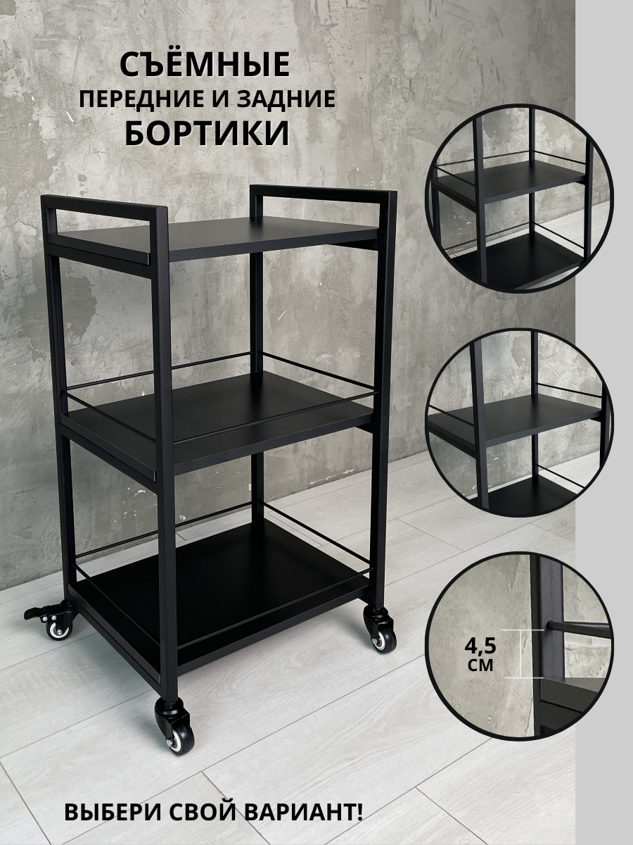 - 3 – ярусная металлическая конструкция оснащена надежными колесами из металла с тормозом, обеспечивающими плавный и тихий ход.