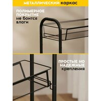 Этажерка выполнена из прочного материала, что гарантирует долговечность и надежность. Металлическая конструкция устойчива к воздействию влаги, что делает ее особенно полезной для ванной. На полочках легко разместить косметику, бытовую химию, полотенца или кухонные принадлежности, а также различные мелочи, которые часто теряются в больших шкафах.
