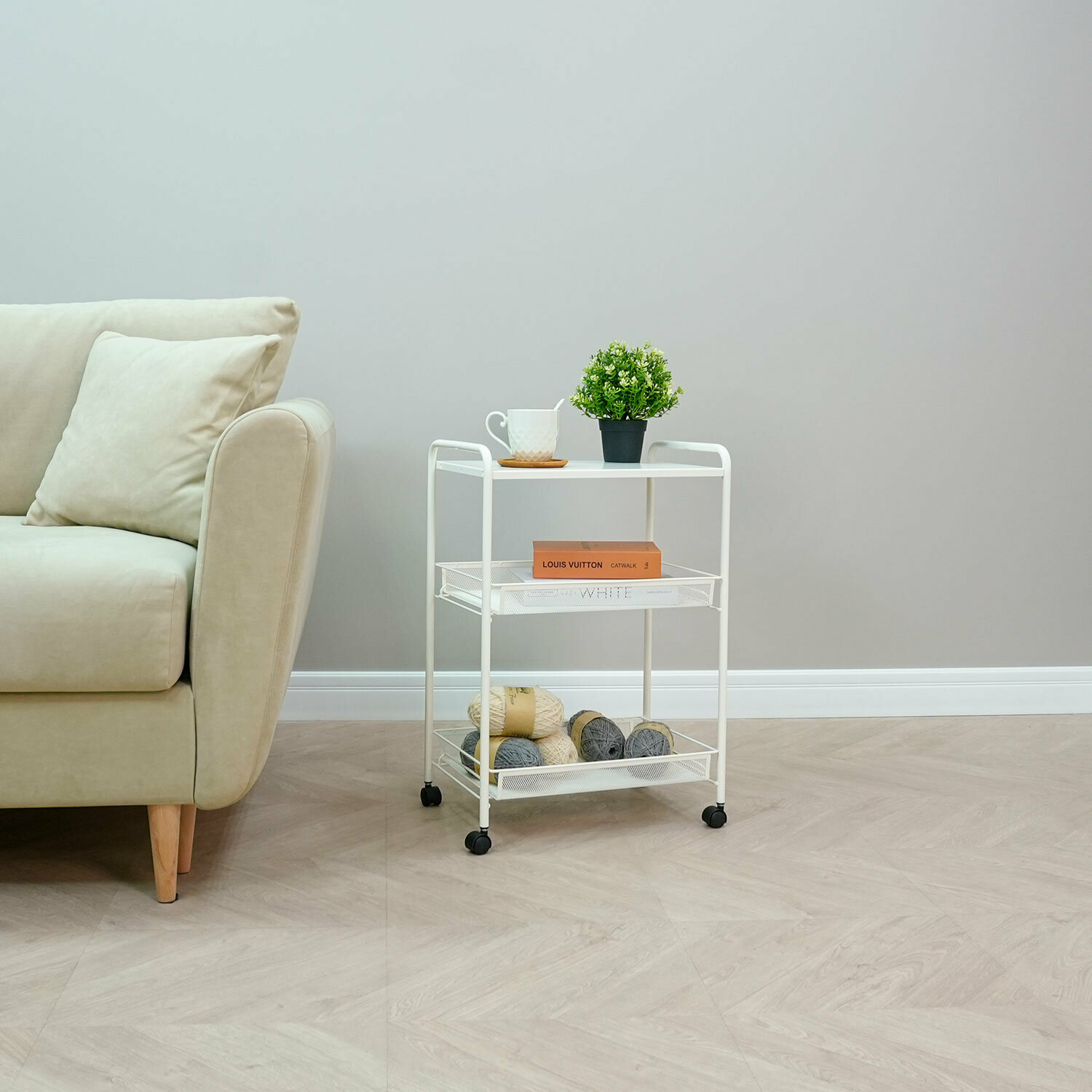 Офисно-бытовая этажерка "Ладья-33КС" предназначена для хранения хозяйственных товаров, канцелярских принадлежностей, документов и предметов обихода в офисах и в быту. Ее применение позволяет оптимально организовать рабочее пространство, сэкономить место. Этажерка выполнена из прочной металлической трубы 14 мм и стального листа в мелкую сетку. Две прочные широкие металлические корзины. Нагрузка на корзину – до 10 кг. Увеличенное расстояние между нижними корзинами для высоких предметов. Полка-столик из стального листа. Дополнительный пластиковый декоративный крючок для мелочей. На ножках предусмотрены пластиковые поворотные роликовые опоры. Изделие поставляется в разобранном виде в картонной коробке с ручкой. Простая сборка, без применения инструментов. Тип товара: этажерка. Количество ярусов: 2 шт. Материал: металл. Максимальная нагрузка на ярус до: 10 кг. Самоориентирующиеся колеса для перемещения: да. Цвет: белый. Соответствует требованиям госта: ГОСТ 16371-2014. Высота: 650 см. Ширина: 450 см. Глубина: 300 см. Вес: 3.3 кг Бренд - ZMI. Производитель - Россия. Артикул - Э 356 Б. Штрихкод - 4610093785669
