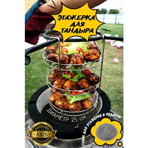 Этажерка для тандыра позволяет приготовить множество мясных, грибных, рыбных или овощных блюд, причём нередко одновременно: на нижнем ярусе может разместиться один вид продуктов, на среднем — иной, и на верхнем расположится третий. Этажерка нашего производства очень прочна, производится из пищевой нержавеющей стали, включает в себя и дополнительное кольцо, которое не позволяет продуктам «выскочить» за её пределы.