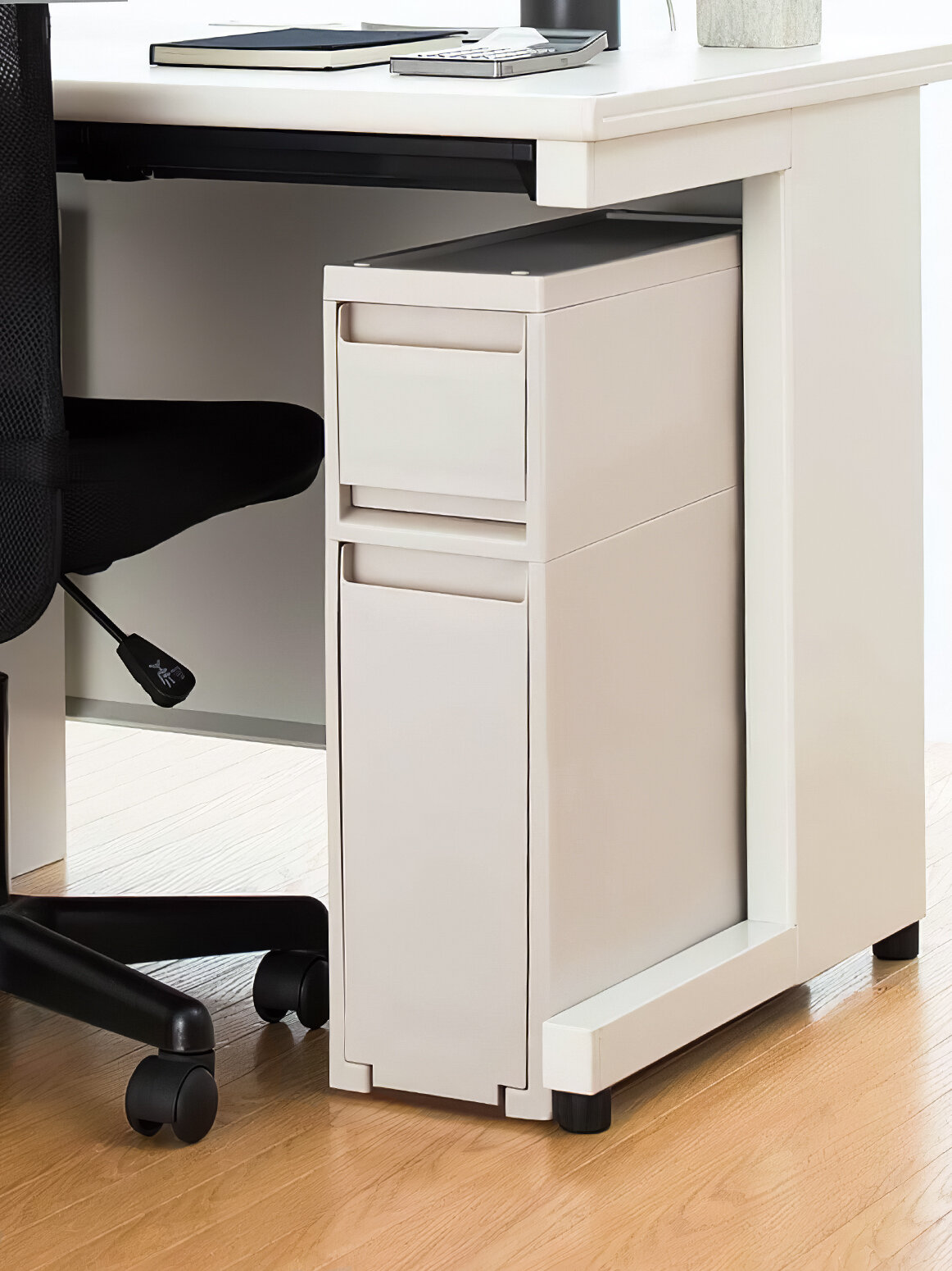 Представляем вашему вниманию этажерку с 2 выкатными ящиками японского бренда товаров для дома и офиса Tenma. В качестве материала для изготовления использован безопасный пищевой пластик полипропилен. Внутренние длина и ширина каждого ящика равны 40 и 13 см соответственно, при этом к передней стенке они сужаются до 11 см. Внутренняя высота верхнего отделения — 13 см, а нижнего — 34,7 см. Полные внешние габариты всей этажерки при измерении в формате «длина х ширина х высота» по предельно выступающим элементам составляют 44,6 х 16,9 х 57,6 см. Благодаря умеренной высоте эта модель может с легкостью поместится под типовой рабочий стол, обеспечив быстрый доступ к содержимому на расстоянии вытянутой руки. Мягкий светлый цвет корпуса органично вписывается в интерьер и подчеркивает хороший вкус владельца. Ручки верхнего ящика имеют специальные углубления для пальцев как сверху, так и снизу, что дает дополнительную степень свободы, когда нужно открыть хранилище с частично занятыми руками. Позаботившись об удобстве и безопасности будущего пользователя, производитель предусмотрел ограничители, препятствующие выпадению полностью выдвинутого ящика. Верхняя поверхность этажерки рассчитана на предельную нагрузку 3 кг, верхнее отделение — на 5 кг, а нижнее — на 10 кг. Для максимального продления срока службы хранилища в полностью функциональном виде производитель предостерегает от вставания на него и от использования предмета в качестве подставки или подпорки для тяжелых конструкций. Навести порядок на рабочем месте помогают практичные и эстетичные решения от компании Tenma.