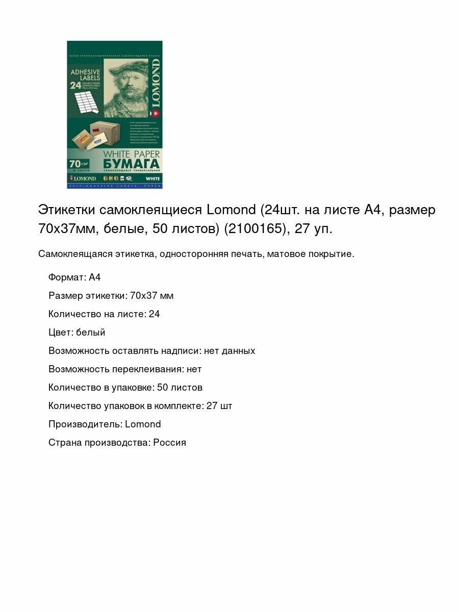Этикетки самоклеящиеся Lomond (24шт. на листе А4, размер 70×37мм, белые, 50 листов) (2100165), 27 уп.: сравнение цен, характеристики, фото, актуальное наличие и цены.
