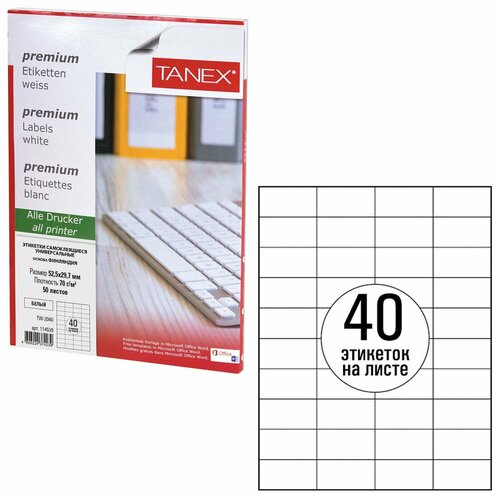 Этикетки самоклеящиеся Tanex (52.5х29,7мм, 40шт. на листе А4, белые, 70 г/кв. м, 50 листов) (TW-2040), 20 уп.: сравнение цен, характеристики, фото, актуальное наличие и цены.