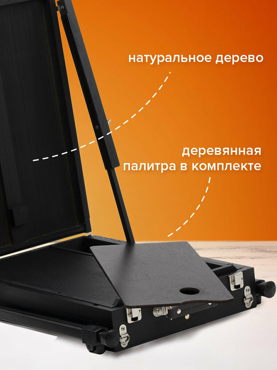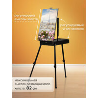 Изготовлен из сосны с применением качественной фурнитуры. Оснащен ящиком для хранения кистей и палитрой для красок. Этюдник позволяет комфортно работать как сидя, так и стоя благодаря съемным телескопическим ножкам длиной 77 см и регулирующему наклону холста с его максимальной высотой до 82 см. Для удобства переноски имеется регулируемый тесемный ремень.