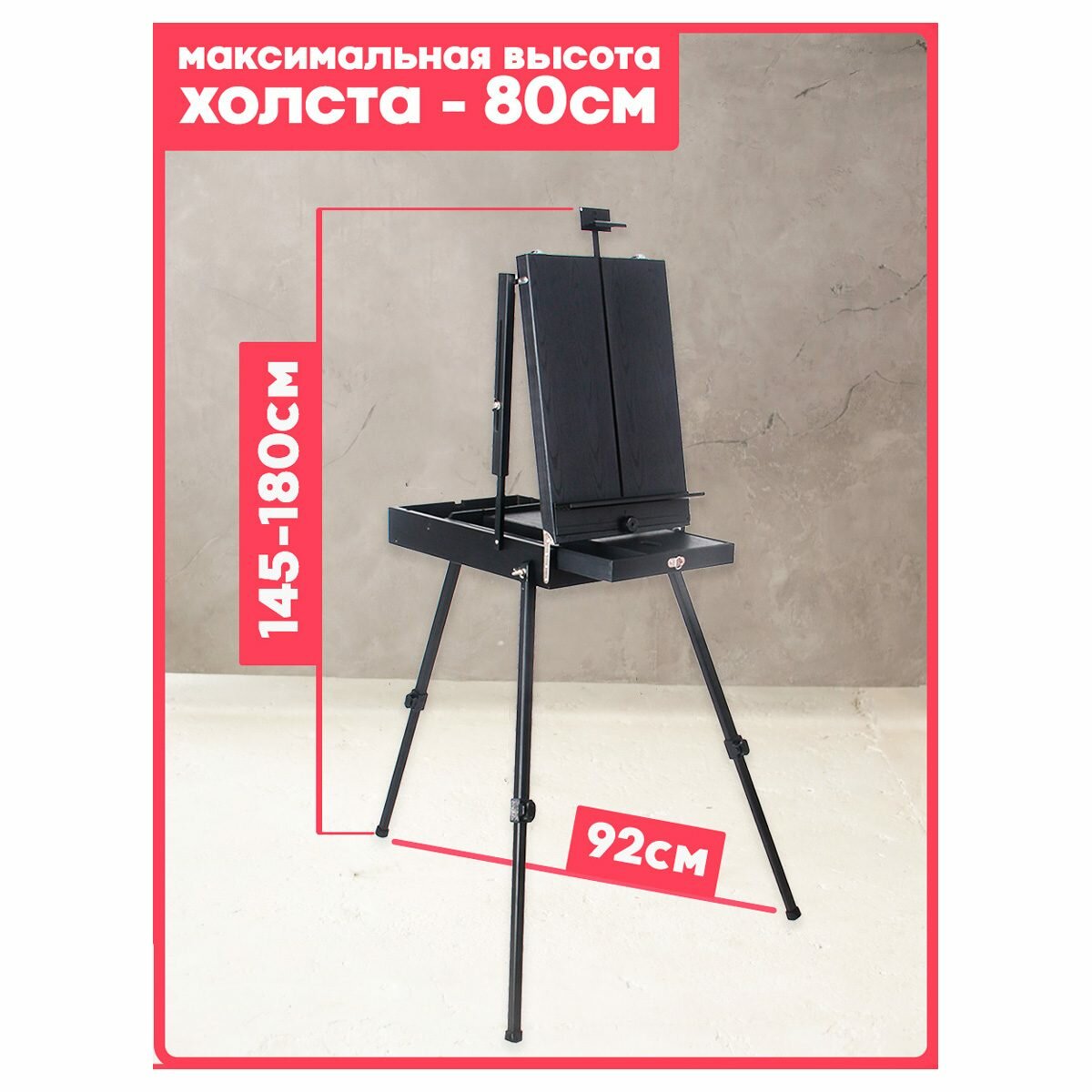 Этюдник оборудован ящиком для хранения художественных принадлежностей, что позволяет удобно организовать рабочее пространство и всегда иметь под рукой необходимые материалы. Размер этюдника в сложенном состоянии составляет 78x92x145 см, а максимальный размер холста - 80 см. Это позволяет легко транспортировать и хранить этюдник, а также обеспечивает достаточное пространство для работы с холстом.