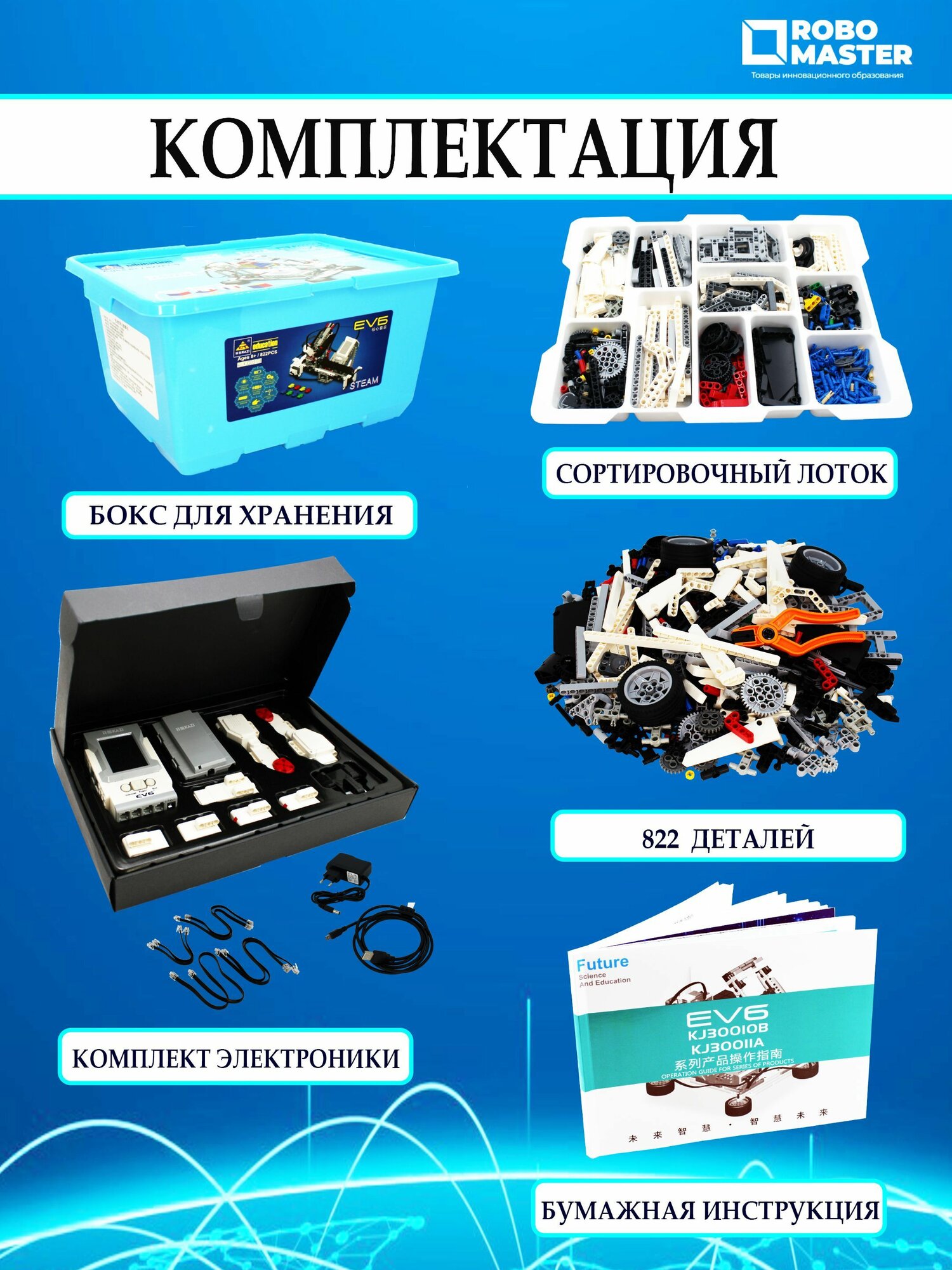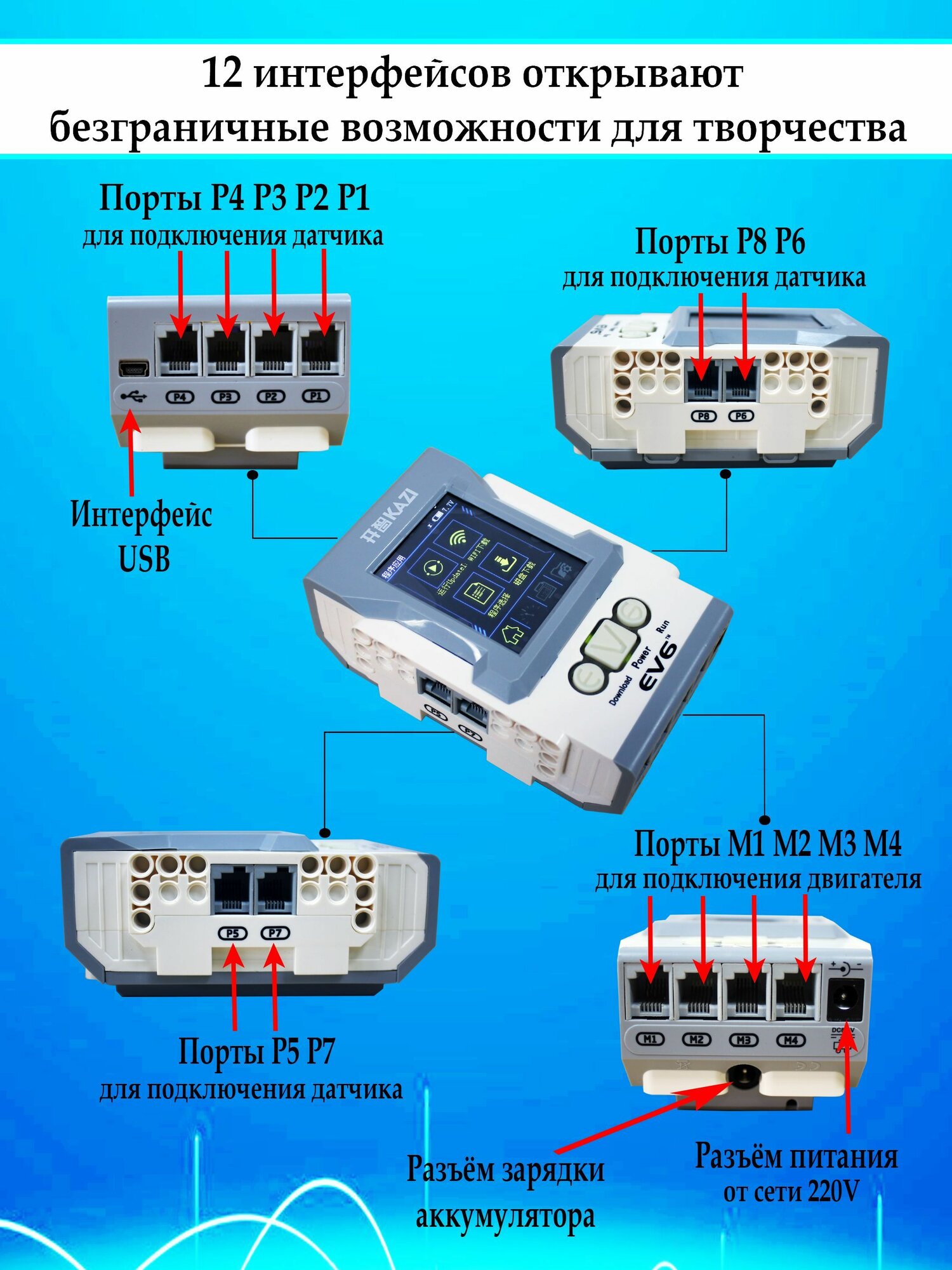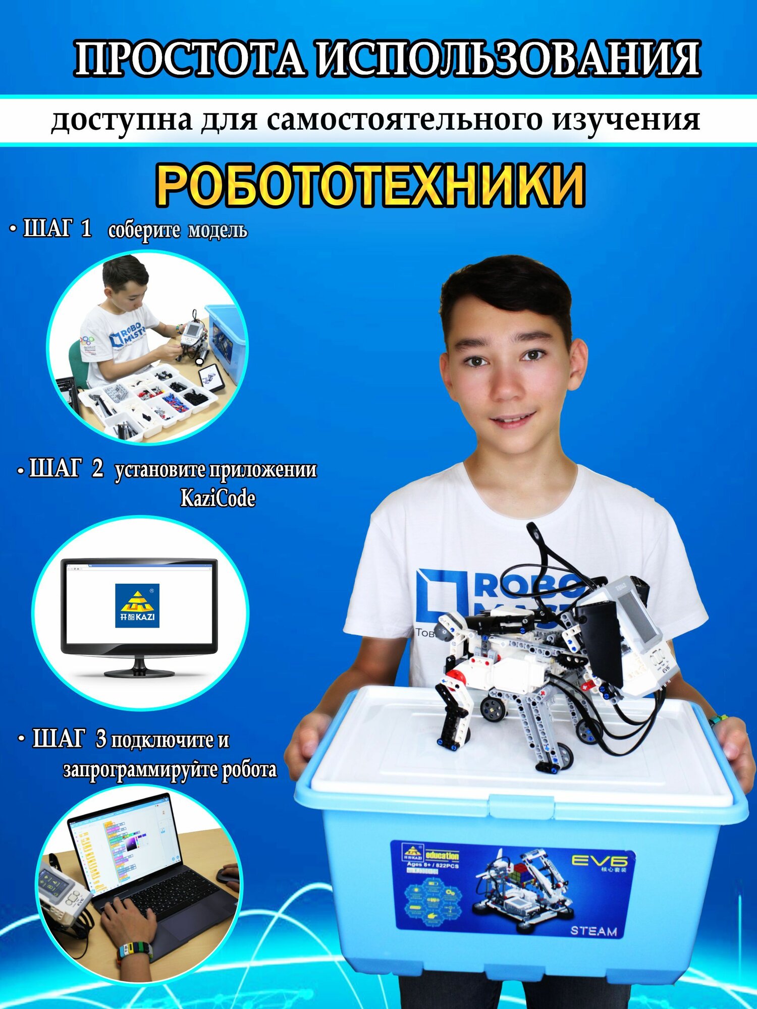 Kazi mindstorms EV6 является универсальной средой программирования для современных конструкторов. При помощи данной программы знакомство с компьютерными кодами становится более увлекательным и интересным, поэтому каждый пользователь по достоинству оценит функционал данного конструктора. Достаточно следовать простейшим инструкциям, после чего вы сможете самостоятельно приступить к написанию кода, который наделит робота множеством интерактивных возможностей! С открытой платформой программирования SCRATCH многие пользователи могут создавать роботов с инновационным сознанием и характеристиками. Подключение к компютеру происходит через USB кабель или через Bluetooth. Самым главным преимуществом данного конструктора является качество. Пластик, использованный при изготовлении деталей, не содержит токсичных веществ и является очень прочным по своей структуре. Электронные компоненты также заключены в прочные защитные корпуса, которые защищают их от механических воздействий, и оптимизируют для интенсивной эксплуатации. Программа EV6 является очень удобной в процессе изучения и эксплуатации. Интуитивный интерфейс не вызывает затруднений в работе, поэтому даже самые маленькие инженеры смогут без труда запрограммировать своего робота на выполнение следующих задач: Повороты вокруг своей оси; Ходьба, прыжки или езда; Выстрелы; Ползанье. Это лишь малая часть интерактивных характеристик, доступных для EV6. Более опытные пользователи смогут заняться созданием более сложных кодов, которые позволят заметно расширить функциональные возможности индивидуальных роботизированных проектов. Теперь больше не нужно ограничивать себя простыми инструкциями и правилами! Приложение SCRATCH , используемое для управления конструкциями, не только дарит положительные эмоции, но также позволяет организовывать целые чемпионаты со своими друзьями. Соревнуйтесь в скорости, ловкости и меткости, выставляя на поле состязаний своих личных роботов. За таким процессом можно провести немало часов, наслаждаясь каждым моментом локального чемпионата! Не отказывайте себе в удовольствии! В комплекты EV6 входят следующие электронные компоненты: Моторы; Датчики различного назначения; Пластиковые кубики для сборки корпуса. Всего этого хватает для того, чтобы изготовить своего первого робота! Для вас доступно порядка 17 схем, каждая из которых обладает уникальным набором функций, взаимодействующих не только с окружающим миром, но и с пользователем. Впечатления от игры остаются только самые яркие, из-за чего набор придется по вкусу людям всех возрастов. С ним можно играть даже в большой компании! Характеристики: Тип: конструктор Материал: пластик Количество конструкций: 17 Возраст: от 6 лет Комплектация: Набор основных пластиковых блоков 822 шт. 14 декоративных наклеек Программный блок Датчики света и касания Инфракрасные датчики 2 больших и 1 средний мотор