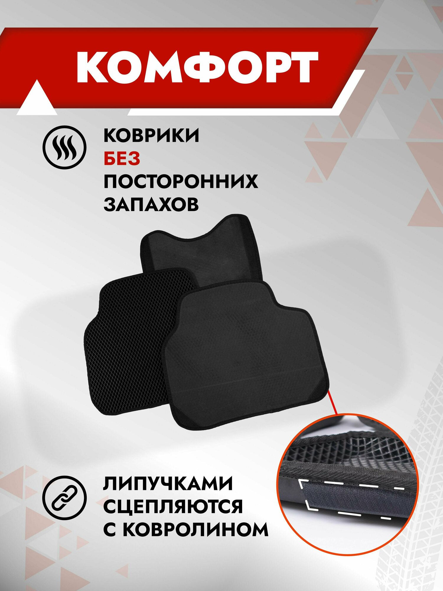 Формованные коврики EVA выполнены из приятного и лёгкого материала Ethylene Vinyl Acetate, который обеспечивает постоянный комфорт и удобство. Варианты цвета окантовки - Черный, синий, красный, серый. Глубокая ячеистая структура хорошо удерживает воду и мусор даже во время активного вождения автомобиля. Чтобы очистить коврики от скопившейся грязи, достаточно перевернуть их. Материал ковров прекрасно переносит высокие и низкие температуры, спокойно переносит контакты с химическими реагентами. Не деформируется и не пахнет при жаре до +50 °С, не становится хрупким и не трескается при морозе до -40 °С.