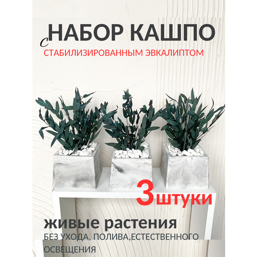Стильный предмет интерьера 3 кашпо из высокопрочного гипса с натуральным стабилизированным эвкалиптом. Яркий и экологичный декор для вашего дома. Нестандартный и запоминающийся подарок для родных и близких.