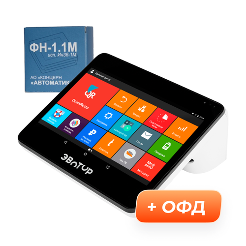 Эвотор 10 - Смарт-терминал. Соответствует требованиям 54-ФЗ. Работает с любым ОФД. Готов к работе с ЕГАИС. 10-дюймовый экран. Идеально подходит для кафе и ресторанов (интегрируется с популярными программами управления общепитом). Оснащен аккумулятором, работает без подзарядки до 12 часов (можно торговать и в ресторане и на фестивале в палатке). Интерфейсы - 5xUSB, RS-232, RJ12, Ethernet, Wi-Fi (протокол IPv4), Bluetooth 4.0, GSM 2G, 3G. Можно подключить банковский терминал, принтер этикеток, денежный ящик, весы и другую технику. Используется самая распространенная чековая лента шириной 57 мм