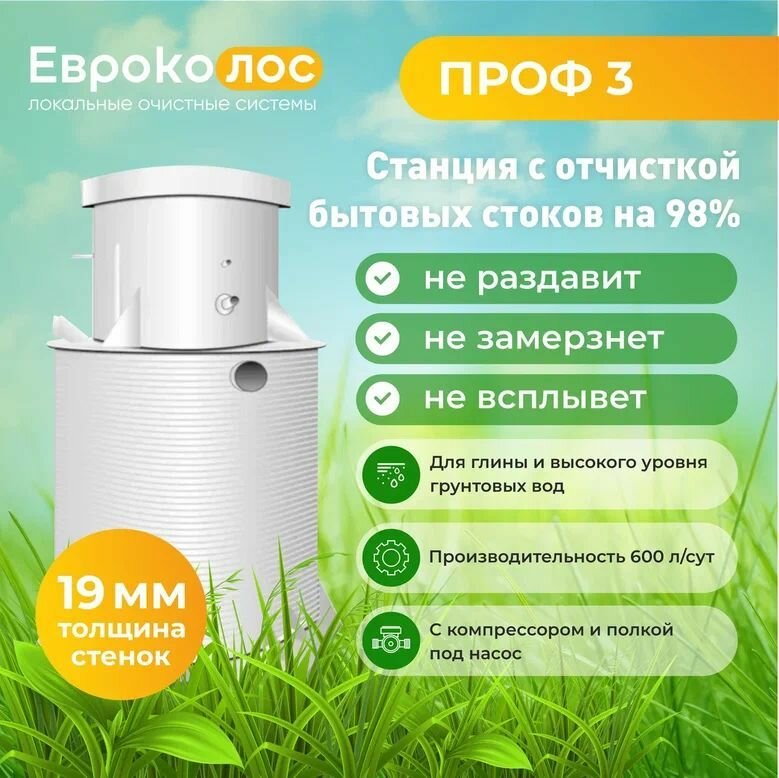Автономная станция биологической очистки хозяйственно-бытовых сточных вод Евроколос Проф с компрессором предназначена для создания локальной канализационной системы на загородных участках с сезонным или постоянным проживанием, не полключенных к центральной канализации. Локальное очистное сооружение (ЛОС) Евроколос Проф обеспечивает как грубую механическую, так и биологическую очистку канализационных сточных вод до 98% с возможностью отвода очищенной воды в канаву.