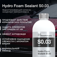 Hydro Foam Sealant S0.03, Антипыльный, Супергидрофобный и с высокой степенью блеска, УФ защиты и длительностью удержания на лакокрасочном покрытии автомобиля. Концентрат силоксана премиум-класса для формирования водоотталкивающей поверхности (лакокрасочного покрытия, стекла и пластмассы) и придания ощущения бархатистого лоска. Новейшая формула для придания насыщенного блеска в сочетании с высококачественными защитными компонентами обеспечивает чрезвычайно насыщенный блеск лакокрасочного покрытия, противодействует выцветанию не окрашенных пластмассовых деталей и значительно повышает водонепроницаемость крыш кабриолетов. Во время дождя он также обеспечивает хорошую видимость благодаря быстрому стеканию капель со стеклянных поверхностей. Фруктовый аромат вишни дарит интенсивное и устойчивое ощущение свежести. Регулярное использование способствует сохранению и накоплению защитного слоя, способного служить несколько моек без перенанесения состава. Одной из задач создания состава было обеспечение антипыльности поверхности. Пылеудержанием страдают все составы конкурентов, типа гидрошайнов, кварцев и прочего. KochChemie значительно перевернула понимание быстрой защиты и длительного эффекта без накопления пыли. Высокая концентрация и разведение 1:750, делают состав высококонкурентным не только по цене, но и по полученному блестящему и длительному результату. Идеальный результат достигается в сочетании с шампунем Reactivation Shampoo.