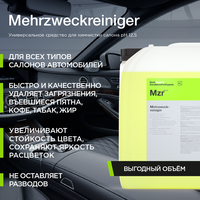MEHRZWECKREINIGER пользуется широкой популярностью. Применяемые ПАВ-транспортёры эффективно удаляют загрязнения и выводят пятна с ткани, велюра, кожи, кожзаменителя, пластика. Присадки в составе снижают щелочное воздействие на поверхность. Увеличивают стойкость цвета, сохраняют яркость и насыщенность расцветок. MEHRZWECKREINIGER предотвращает деформацию и растягивание материала. Не оставляет разводов на поверхностях любого типа. За счет щадящих компонентов в составе подходит для автомобилей марки Mercedes-Benz и имеет его одобрение. Сертификат Daimler-Zulassung (Mercedes-Maybach).