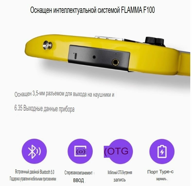 E1000-PB Experience 1000 Электрогитара, черная, Flamma Flamma E1000 — это гитара нового поколения, сочетающая в себе высокое качество изготовления и инновации. Этот инструмент раскрывает безграничный творческий потенциал благодаря интерактивному интерфейсу, предоставляющему предустановки, барабанные петли, метроном и лупер. Музыканты могут получить доступ к творчеству и управлению с помощью суперрегулятора на гитаре и приложения Flamma, что позволяет им изменять и сохранять свои настройки. Больше нет необходимости в громоздких усилителях или сложных педалбордах: Flamma E1000 при необходимости полностью портативна. Гриф из обожженного клена, глянцевая отделка корпуса и накладка грифа из палисандра обеспечивают одновременно эстетику и звучание. Разблокируйте свой уникальный звук. Flamma E1000 легко подключается к вашему телефону или планшету с помощью Bluetooth и открывает 78 гитарных эффектов, 48 барабанных петель и 80-секундный лупер через приложение Flamma. Музыканты могут управлять настройками приложения в соответствии со своими предпочтениями с помощью суперрегулятора на гитаре и с легкостью создавать идеальные настройки. Для живого выступления музыканты могут менять свои пресеты в режиме реального времени, подключив E1000 к беспроводному ножному переключателю C4 (приобретается отдельно). Возможности подключения для бесконечного творчества. Все эффекты, драм-машина и лупер встроены в саму E1000, поэтому их можно легко передавать на усилитель или акустическую систему через выход 6,3мм. Музыканты также могут наслаждаться сольной игрой без усилителя, просто подключив наушники непосредственно к 3,5-мм выходу для наушников на гитаре. Благодаря возможностям Bluetooth плееры также могут отправлять звук прямо на выход Flamma E1000. Просто выберите трек на мобильном телефоне или планшете, подключите его к инструменту и наслаждайтесь игрой под выбранный трек. Запишите свой звук. Вы можете легко записать свою игру просто подключив Flamma E1000 к мобильному телефону или планшету с помощью кабеля OTG (приобретается отдельно) через встроенный выход USB-C. Вы можете создавать свой собственный уникальный звук, используя параметры эффектов приложения Flamma, и напрямую записывать его с помощью видео- или аудиоприложения. Flamma E1000 предоставляет все необходимое для творчества и инноваций без ограничений. Гитара следующего поколения. Flamma E1000 — это универсальный инструмент для гитаристов, желающих поднять свою игру на новый уровень. Помимо высокого качества сборки для отличного звука, интерактивность этой гитары означает больший творческий потенциал и лучшие результаты. Будущее гитары уже здесь, с Flamma E1000. Крепление грифа: болт. Гриф: обожженный клен. Отделка грифа: матовая. Верхний порожек: кость. Профиль грифа: стандартный С, радиус 305 мм. Накладка грифа: палисандр. Метки ладов: перламутр, точки. Лады: 22, джамбо. Анкерный стержень: двойного действия. Мензура: 648 мм. Ширина верхнего порожка: 42 мм. Корпус: тополь. Отделка корпуса: глянцевая. Звукосниматели: нековый FSS-1N сингл; бриджевый FSH-1B хамбакер. Управление: 1 регулятор громкости, 1 тона, 1 супер регулятор, 3-позиционный переключатель. Звуковой процессор: F100. Эффекты: гитарные эффекты 78, барабаны 40, 80 секунд петлитель. Питание: 18650 2600 мА/ч. Время работы от батареи: 8 часов. Время зарядки: 2,5 часа (5В 2А). Цвет: черный Pearl Black.