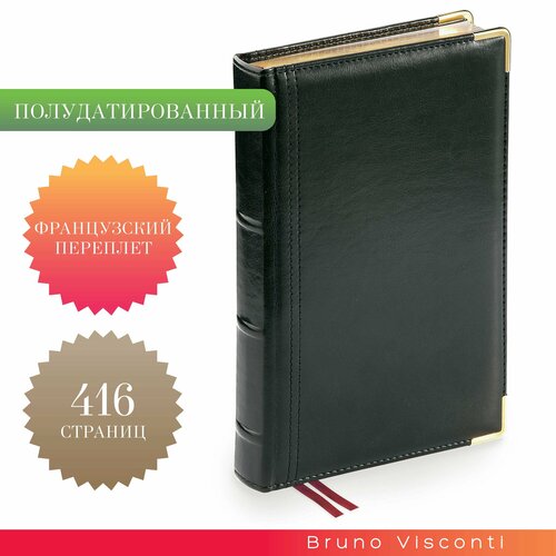 Полудатированный ежедневник "BOSS» формата А5 в твердом переплете – элегантный, стильный деловой аксессуар, отличный помощник в деле планирования рабочего времени. Изящество, статусность и благородство придают ежедневнику: • обложка, выполненная из высококачественной искусственной кожи, которая точно передает фактуру натурального материала; • французский переплет; • золотые металлические уголки обложки; • золотой обрез блока; • декоративная строчка по периметру в тон обложки; • двойное ляссе и перфорированные уголки внутреннего блока для удобства навигации. Внутренний блок с увеличенным количеством страниц – 416, изготовлен из белой бумаги плотностью 80 г/кв. м. Он содержит несколько разделов: • страница для персональных данных; • раздел справочной информации на 18 страницах (планинг по месяцам, телефонные коды, термины международной торговли, энергетическая ценность продуктов, римские цифры, часовые пояса, аэропорты Европы, автомобильные коды, города-миллионники, единицы измерения, штрихкоды, греческие буквы, религиозные праздники, буквенные коды стран, размеры одежды, температура); • раздел для планирования с разлинованными листами и указанием времени с интервалом в один час; • телефонный книга на 28 страницах; • картонный слив-бокс.