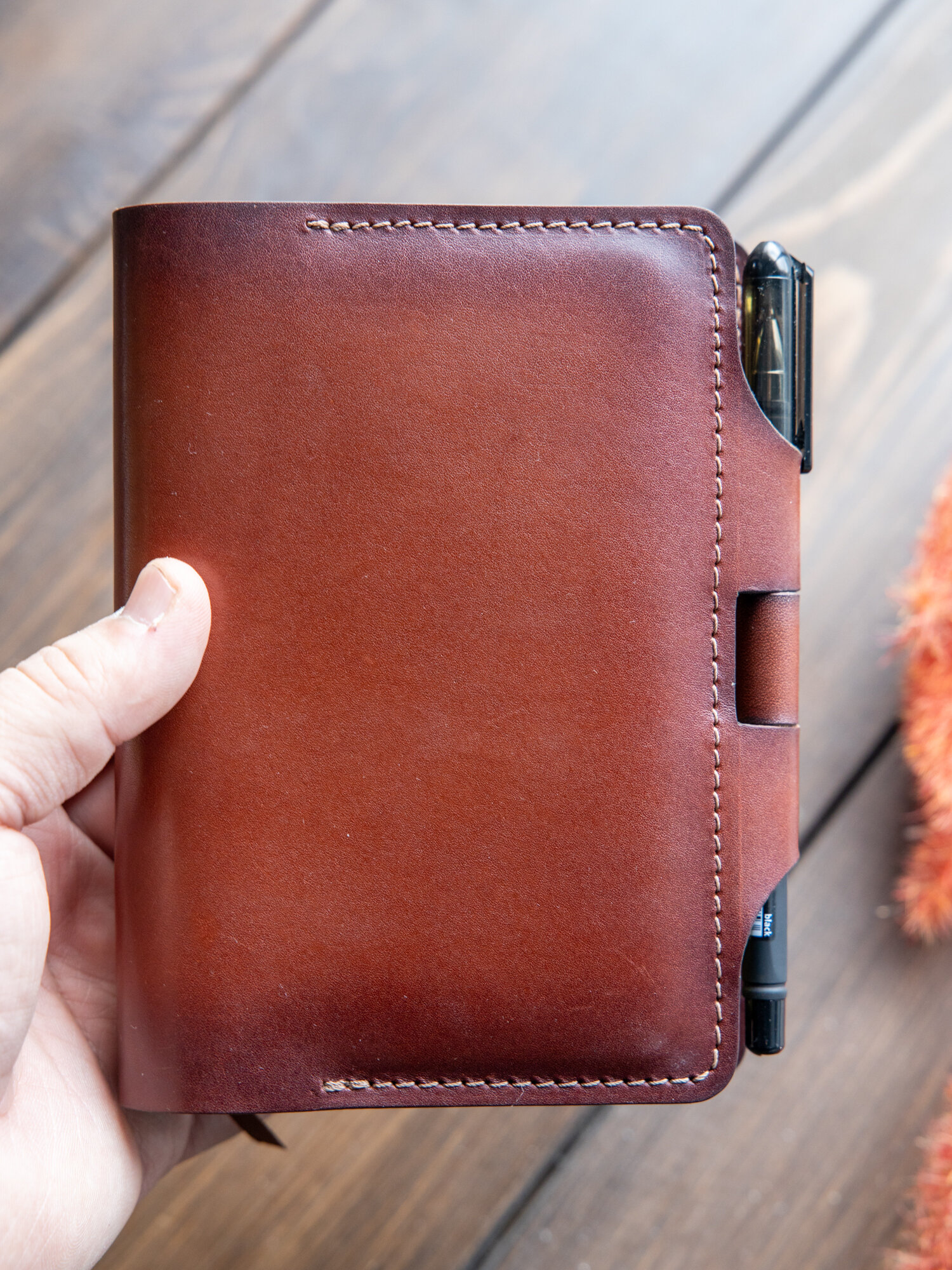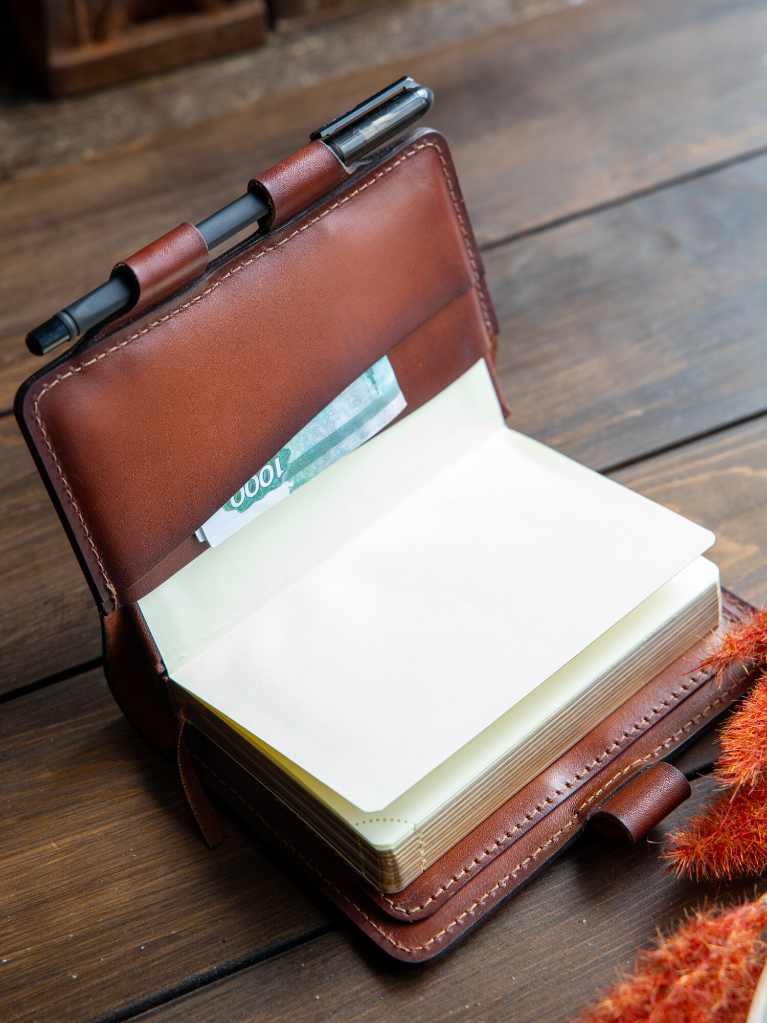 Купить Ежедневник формата А6 из натуральной кожи с дополнительными карманами под карту и деньги с доставкой по всей России.
