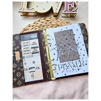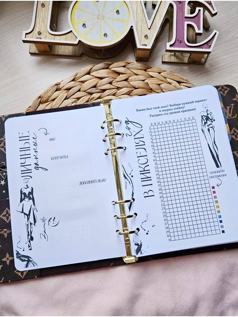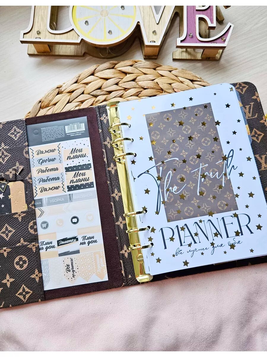 Стильный ежедневник-планер формата А5, полностью ручной работы на кольцевом механизме. Выполнен из искусственной кожи коричневого цвета с тиснением питон и символикой LV, на магнитной застежкой. Внутри блок на 200 дизайнерских страниц, напечатанные на бумаге премиум класса плотностью 120 гр/м2. Форзацы отделаны замшей. На первом форзаце карманы под пластиковые карты. На втором форзаце один сплошной карман. Планер рассчитан на рабочий год с еженедельным планированием. Также включает: личные данные, год в пикселях, колесо баланса, календарь 26-27, планы на год, бюджет, планы на неделю, контакты, логины, список фильмов, список книг, заметки. Так же, все что на фото входит в стоимость: скрепки-бантики, карточки, наклейки, пластиковый разделитель, золотая ручка с короной, бумажный конверт. Карточки, наклейки, пластиковый разделитель могут отличаться на фото. Данный планер станет отличным приобретением, а также помощником в делах, как для себя, таки на подарок. Формат А5. 200 дизайнерских страниц с иллюстрациями. Крепление: кольцевой механизм, размером 22 см. Размер блокнота: 23*17*4см. Размер страниц 14,5*21см.