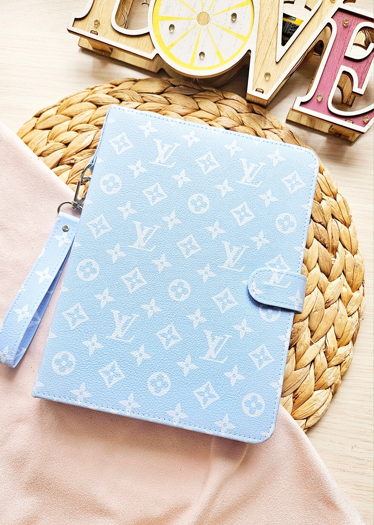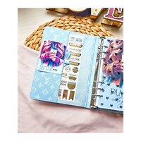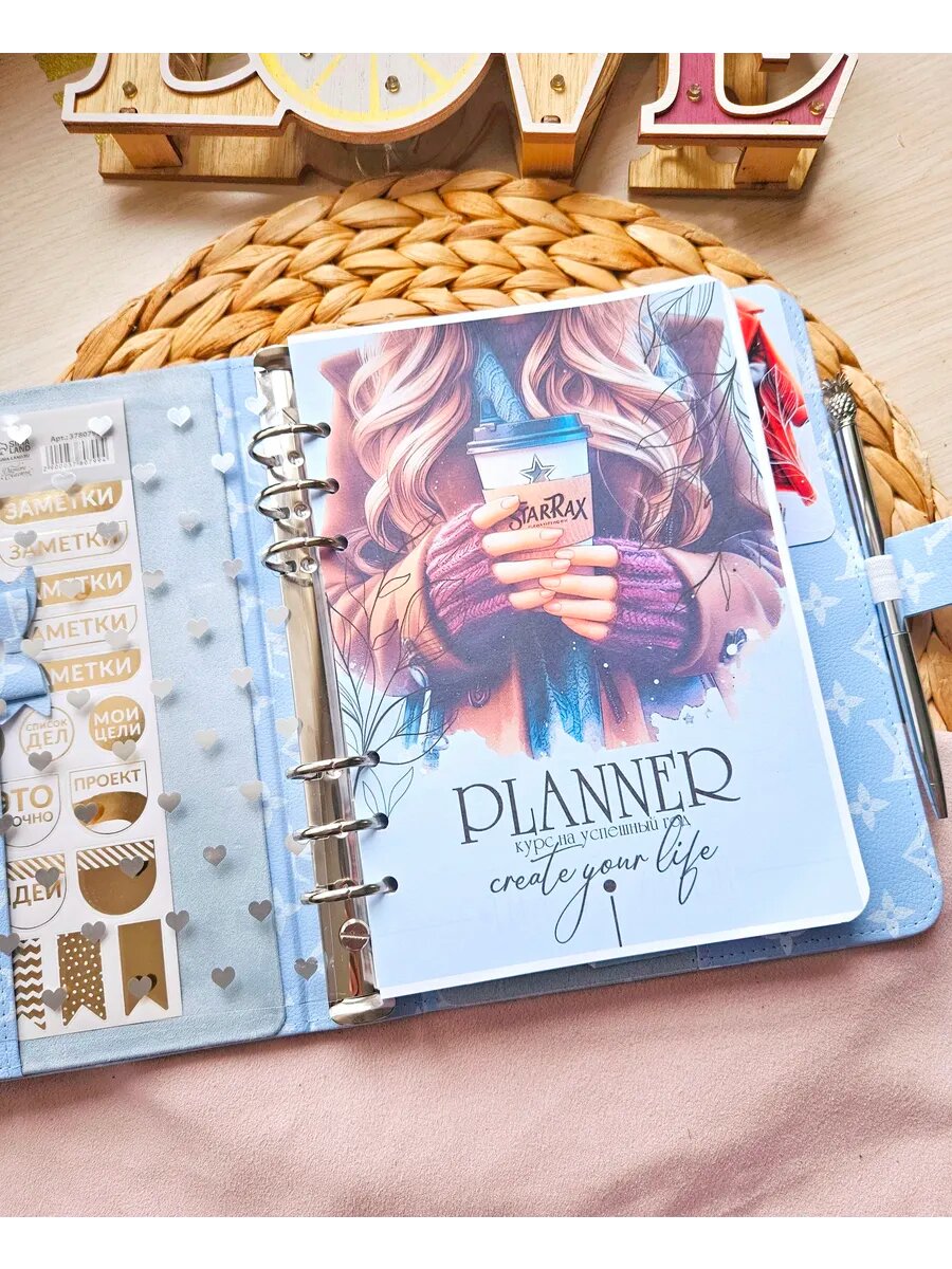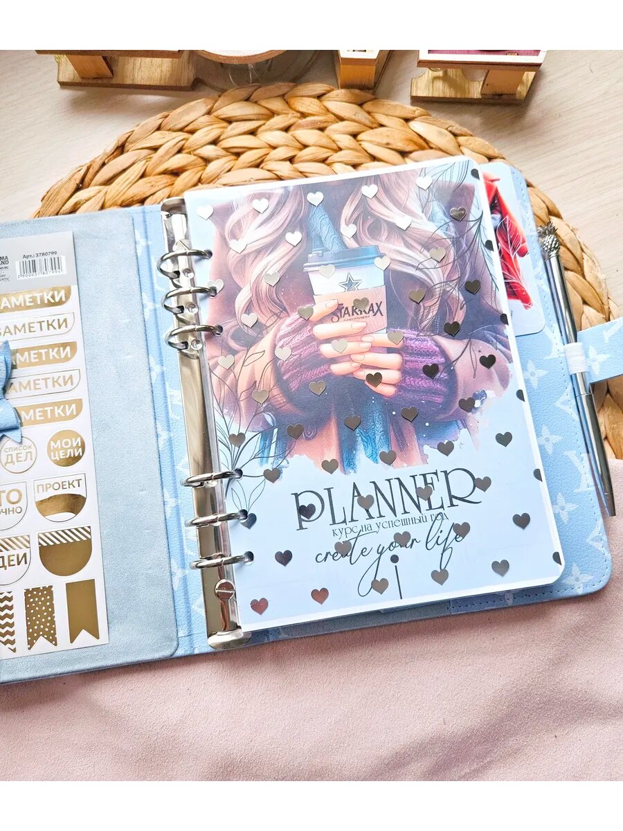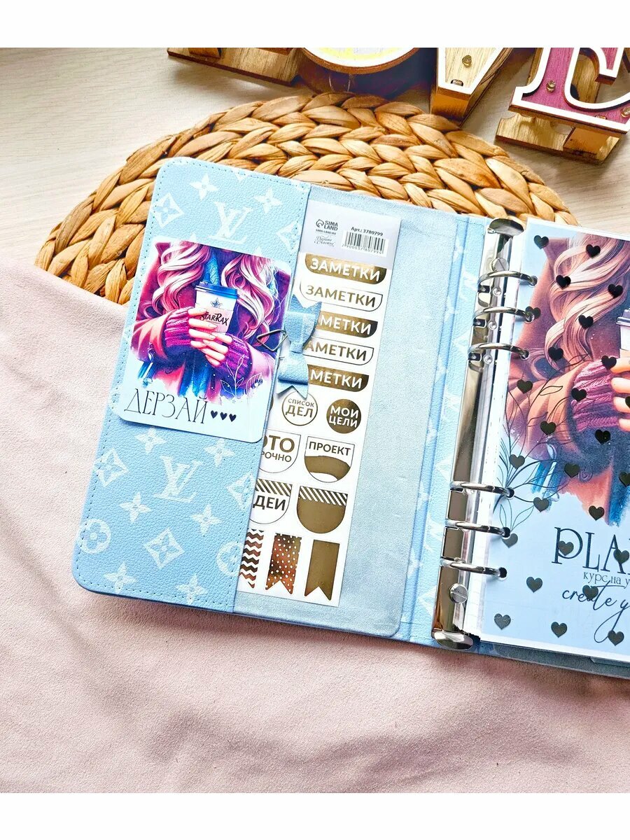 Стильный ежедневник-планер формата А5, полностью ручной работы на кольцевом механизме. Выполнен из искусственной кожи голубого цвета с символикой LV, на магнитной застежкой. Внутри блок на 200 дизайнерских страниц, напечатанные на бумаге премиум класса плотностью 120 гр/м2. Форзацы отделаны замшей. На обоих форзацах по одному сплошному карману. Планер рассчитан на ежедневное планирование. Также включает: личные данные, календарь 26-27, планы на год, колесо баланса, лист желаний, бюджет, планы на неделю, контакты, логины, заметки. Так же, все что на фото входит в стоимость: скрепки-бантики, карточки, наклейки, пластиковый разделитель, ручка с короной, бумажный конверт. Карточки, наклейки, пластиковый разделитель могут отличаться на фото. Данный планер станет отличным приобретением, а также помощником в делах, как для себя, так и на подарок. Формат А5. 200 дизайнерских страниц с иллюстрациями. Крепление: кольцевой механизм, размером 22 см. Размер блокнота: 23*17*4см. Размер страниц 14,5*21см.