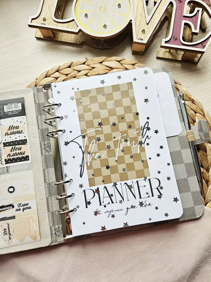 Стильный ежедневник-планер формата А5, полностью ручной работы на кольцевом механизме. Выполнен из искусственной кожи бежевого цвета с тиснением твид и символикой LV, на магнитной застежкой. Внутри блок на 200 дизайнерских страниц, напечатанные на бумаге премиум класса плотностью 120 гр/м2. Форзацы отделаны замшей. На первом форзаце один сплошной, плюс маленький, на втором форзаце один сплошной карман. Планер рассчитан на рабочий год с еженедельным планированием. Также включает: личные данные, год в пикселях, колесо баланса, календарь 26-27, планы на год, бюджет, планы на неделю, контакты, логины, список фильмов, список книг, заметки. Так же, все что на фото входит в стоимость: скрепки-бантики, карточки, наклейки, пластиковый разделитель, ручка с короной, бумажный конверт. Карточки, наклейки, пластиковый разделитель могут отличаться на фото. Данный планер станет отличным приобретением, а также помощником в делах, как для себя, таки на подарок. Формат А5. 200 дизайнерских страниц с иллюстрациями. Крепление: кольцевой механизм, размером 22 см. Размер блокнота: 23*17*4см. Размер страниц 14,5*21см.