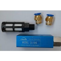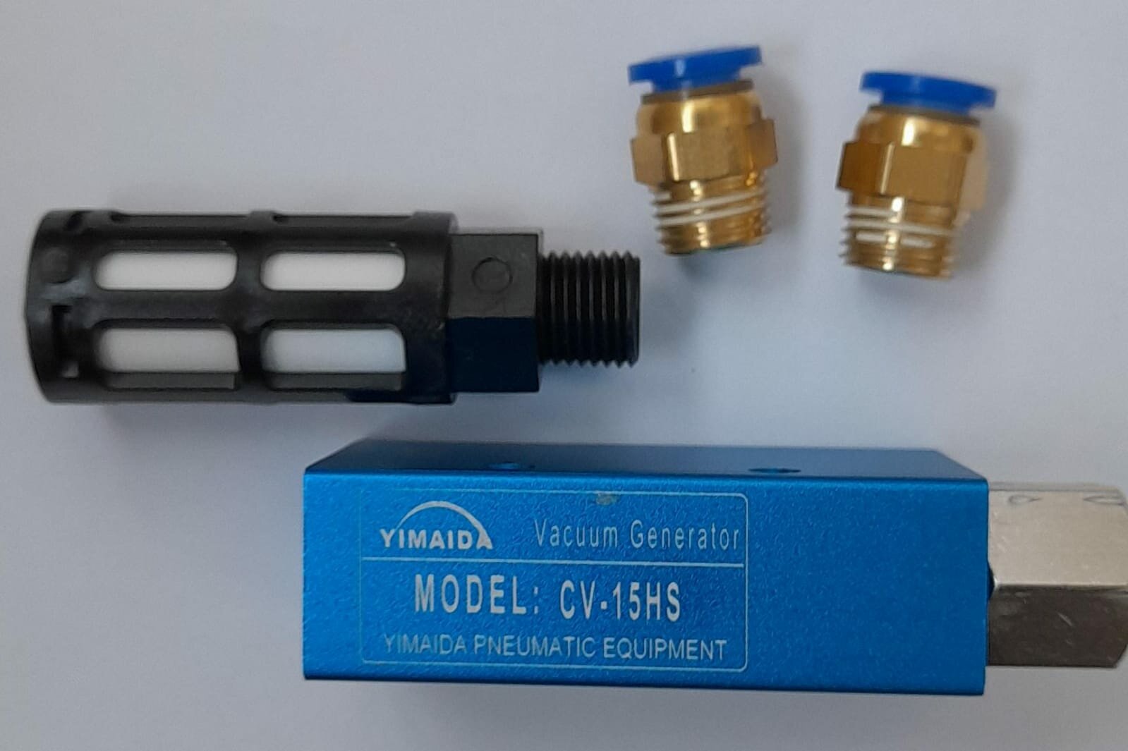 Эжектор вакуумный пневматический Характеристики : Материал корпуса: Алюминий Максимальный вакуум: - 91 кПа Максимальный вакуумный расход: 63 л/мин Потребление воздуха: 100 л/мин Диаметр сопла: 1.5 мм Уровень шума: 72 дБА . Присоединение 1: Rp1/4" ; Присоединение 2: Rp1/4" Рабочая температура: От 0 °C до +60 °C Максимальное давление: 7 Бар Рабочая среда : Сжатый возд. В комплекте переходник с 1/4' на воздушную трубку D 8 мм. - 2 шт.